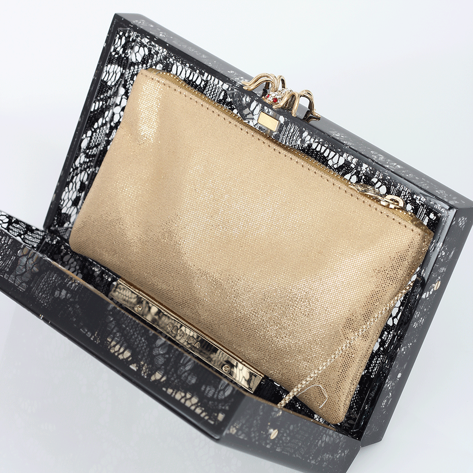 Top Push Clasp Closure And Hinge Bottom With Lace Detail And Gold Shimmer Pouch