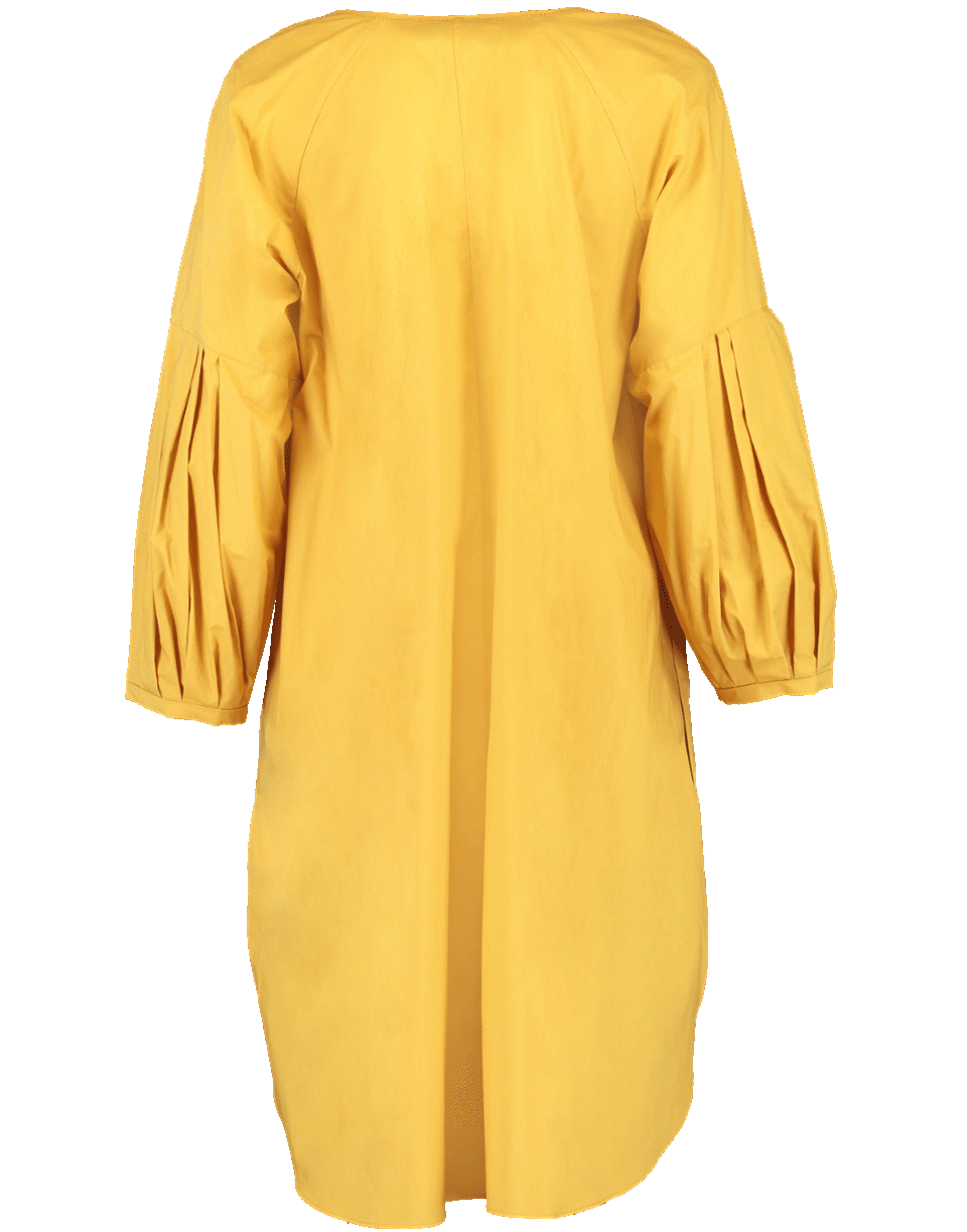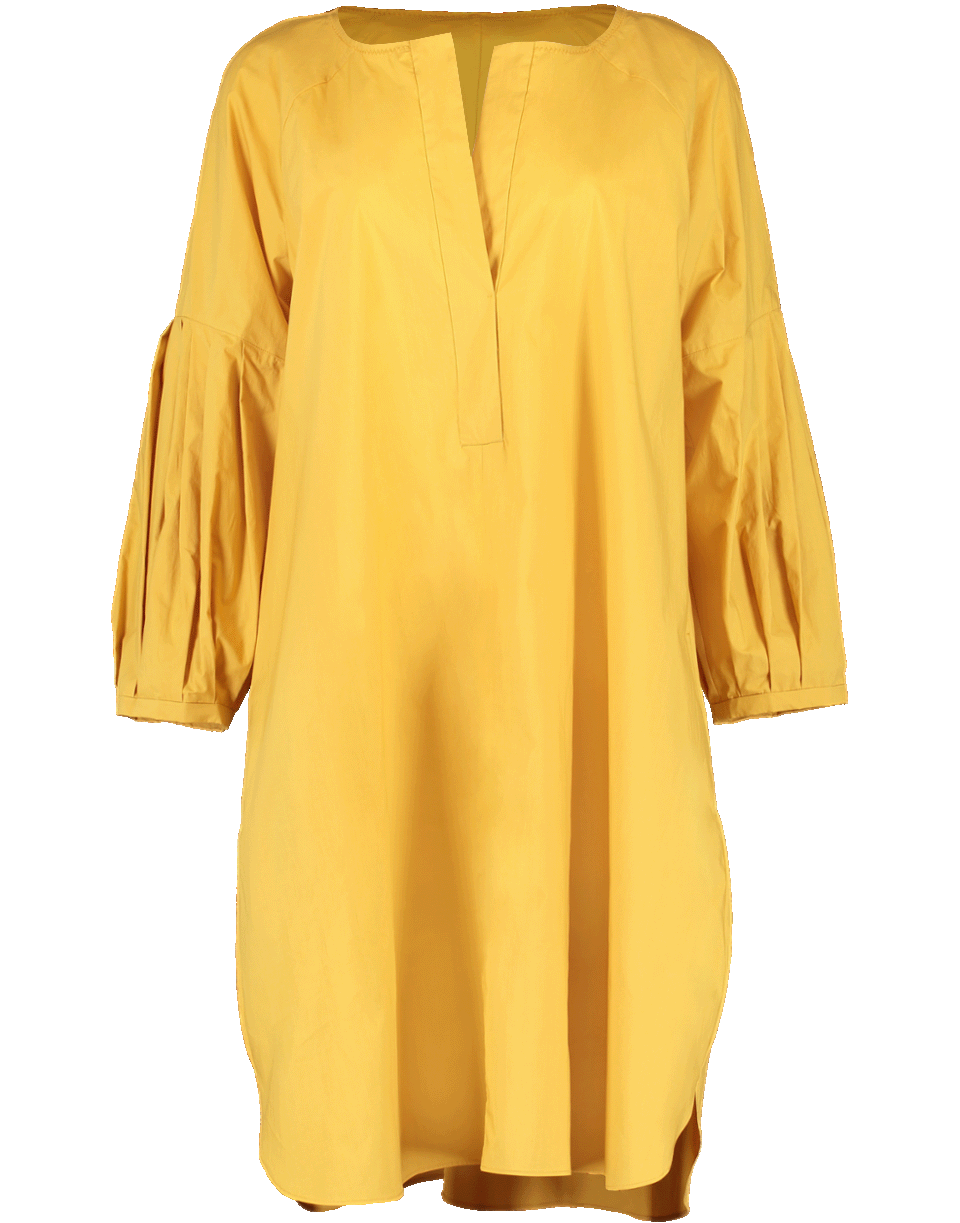 Yellow long sleeve dress by Dorothee Schumacher. This thigh length dress features a loose silhouette with a v-neckline and subtle puffed sleeves.