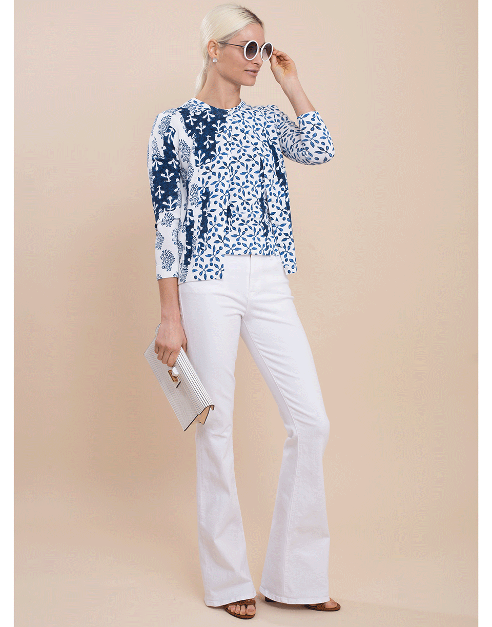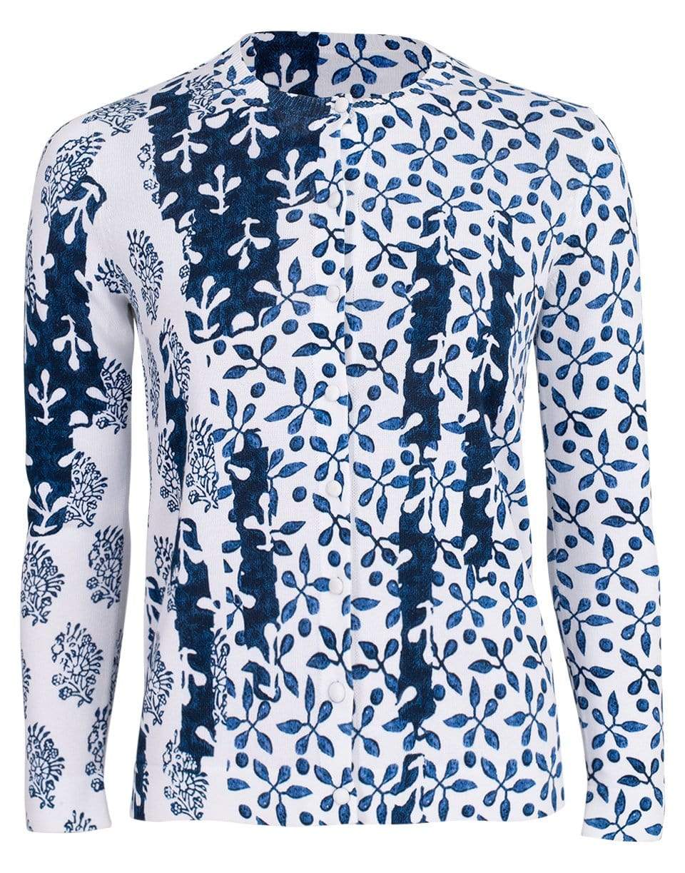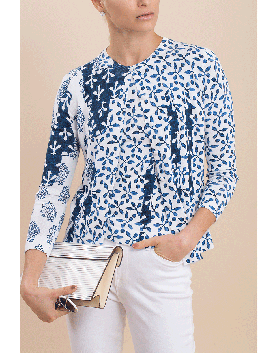 Cropped patchwork cardigan from Oscar de la Renta featuring a crewneck, long sleeves, white button front, and ribbed trims.