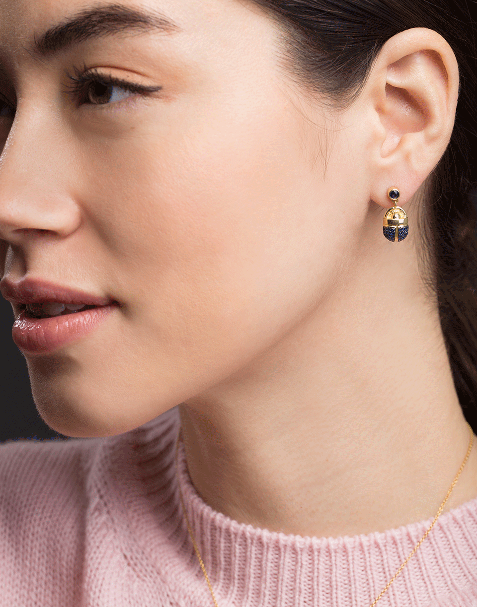Pamela Love pave blue sapphire scarab drop earrings. For pierced ears.