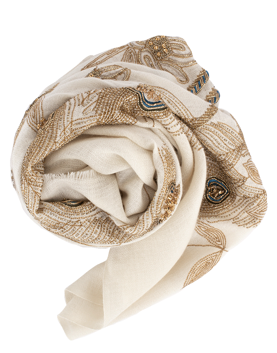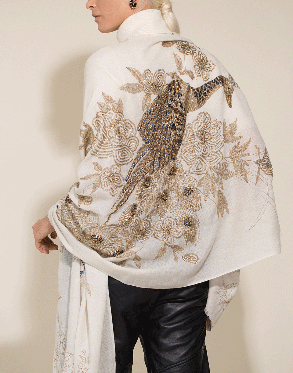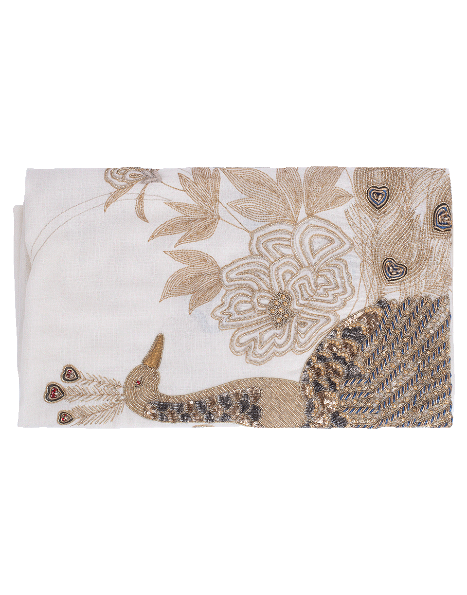 This handcrafted scarf from K. Janavi features an intricate peacock design with handsewn embellishment.