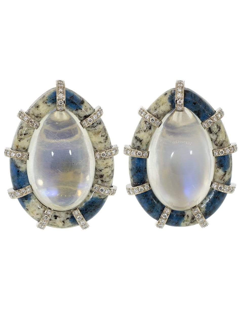 Nicholas Varney clip earrings with a pear shaped blue moonstone set in a K2 blue garnite carved stone with diamonds.