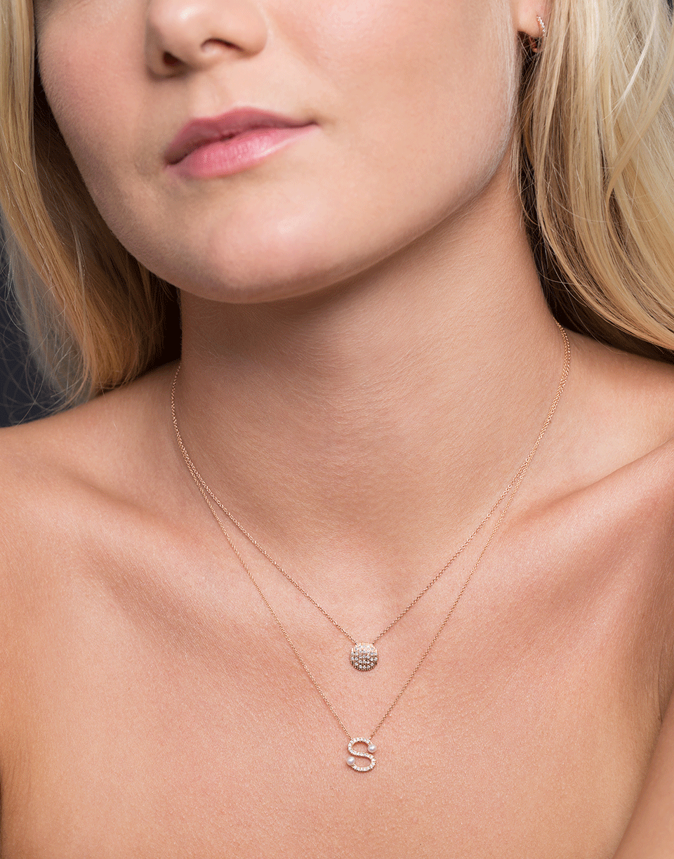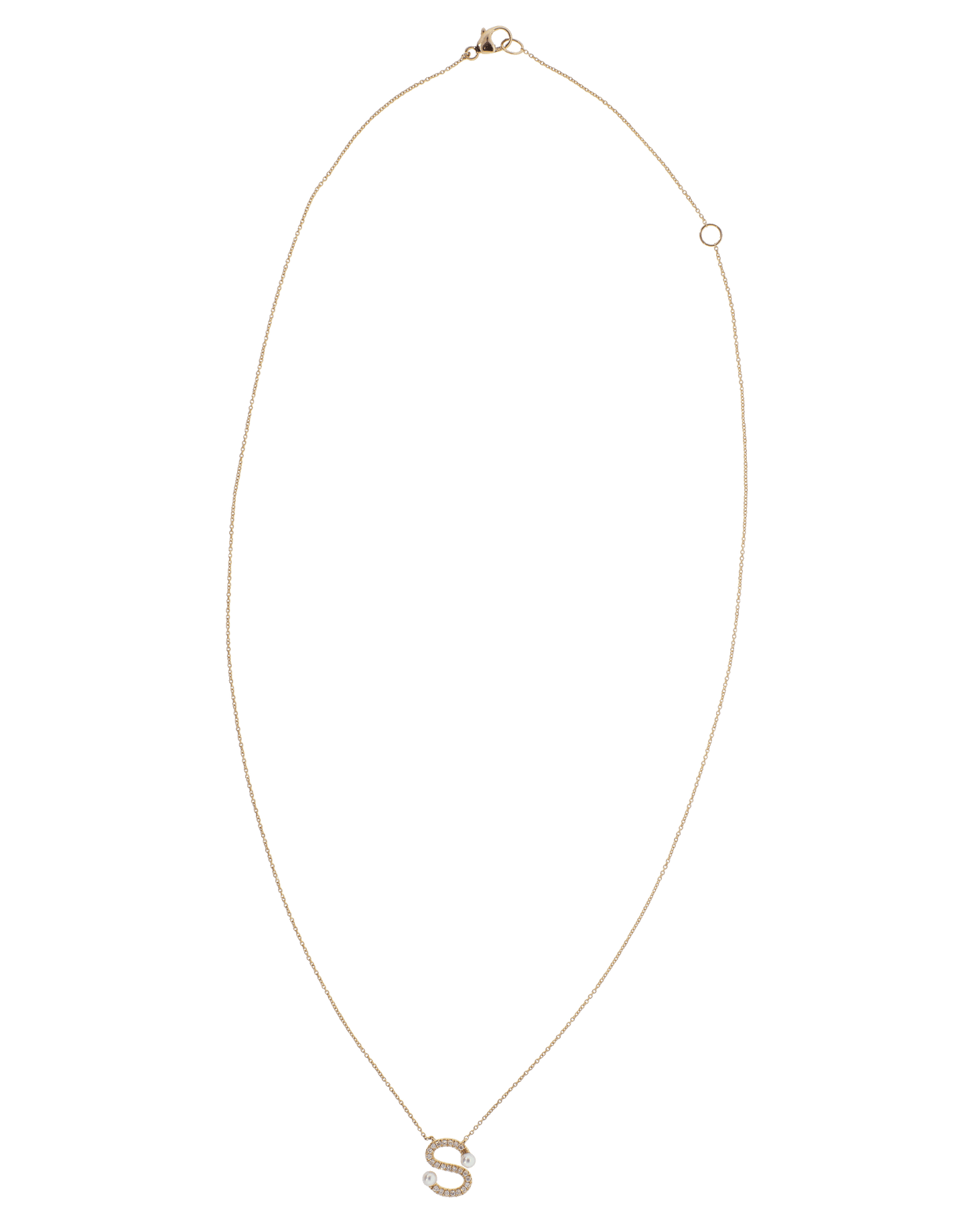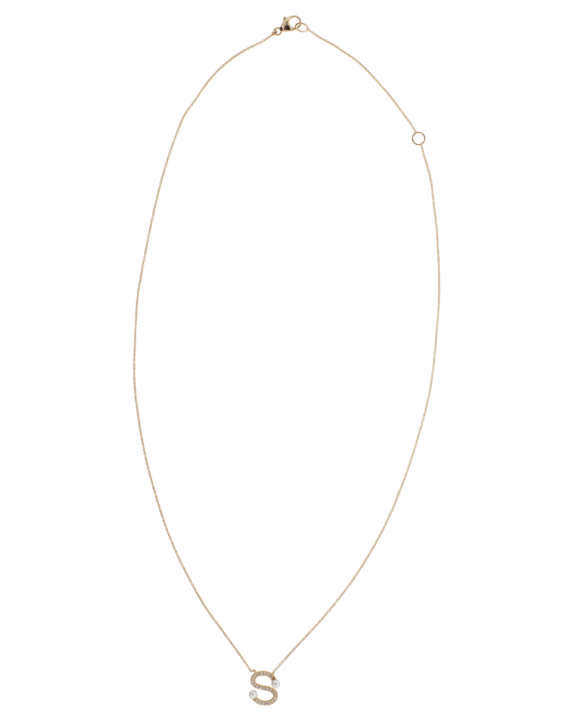 This Dana Rebecca initial pendant necklace features a 'S' with pearls and diamonds set in 14K yellow gold.