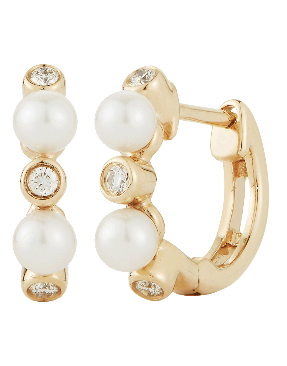 These 14k yellow gold earrings from Dana Rebecca feature a huggie style with pearls and bezel set diamonds.