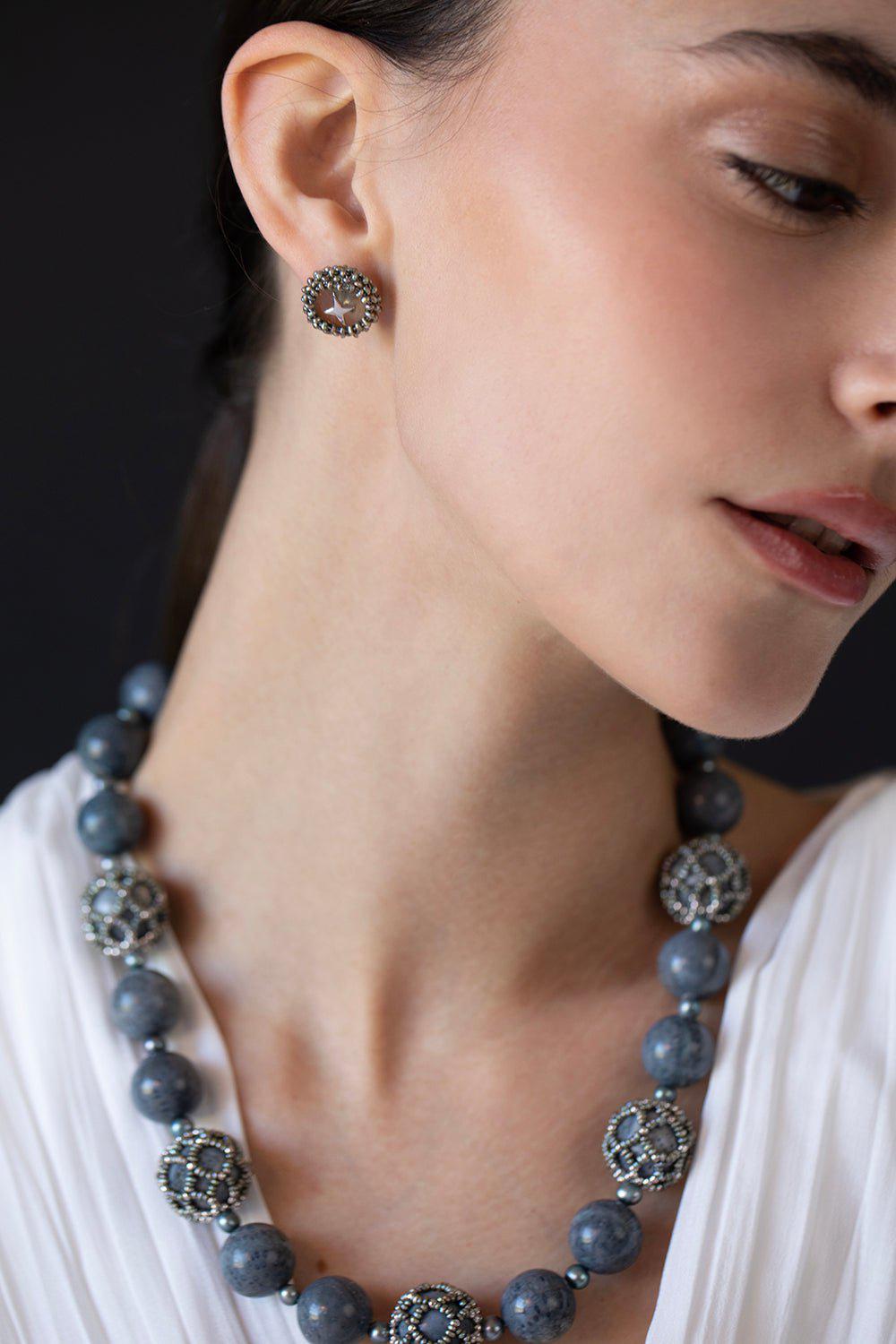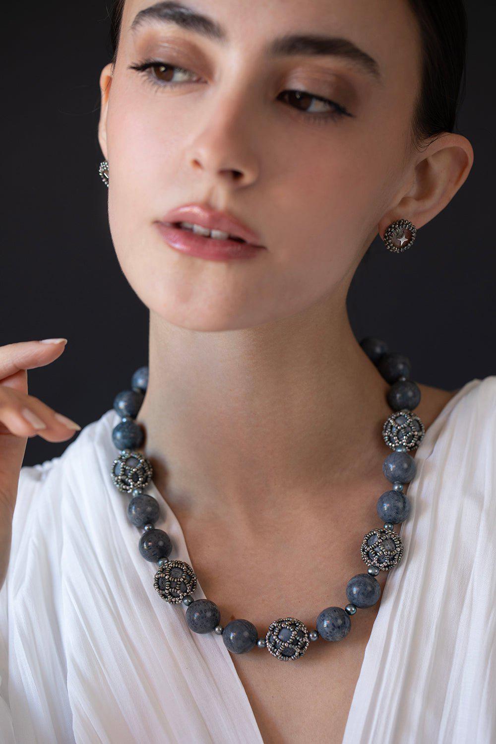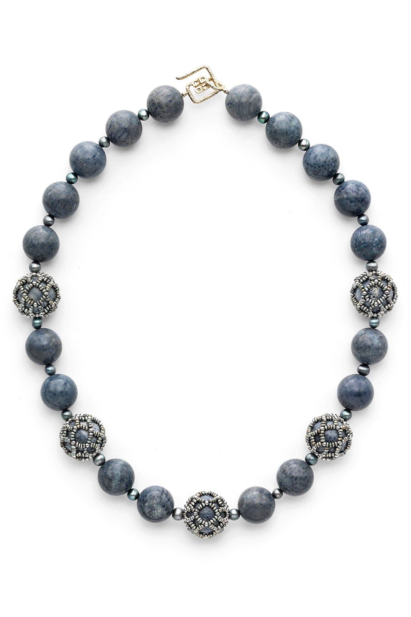 Chris Davies la mer necklace with natural blue coral, pearl and seed pearl.