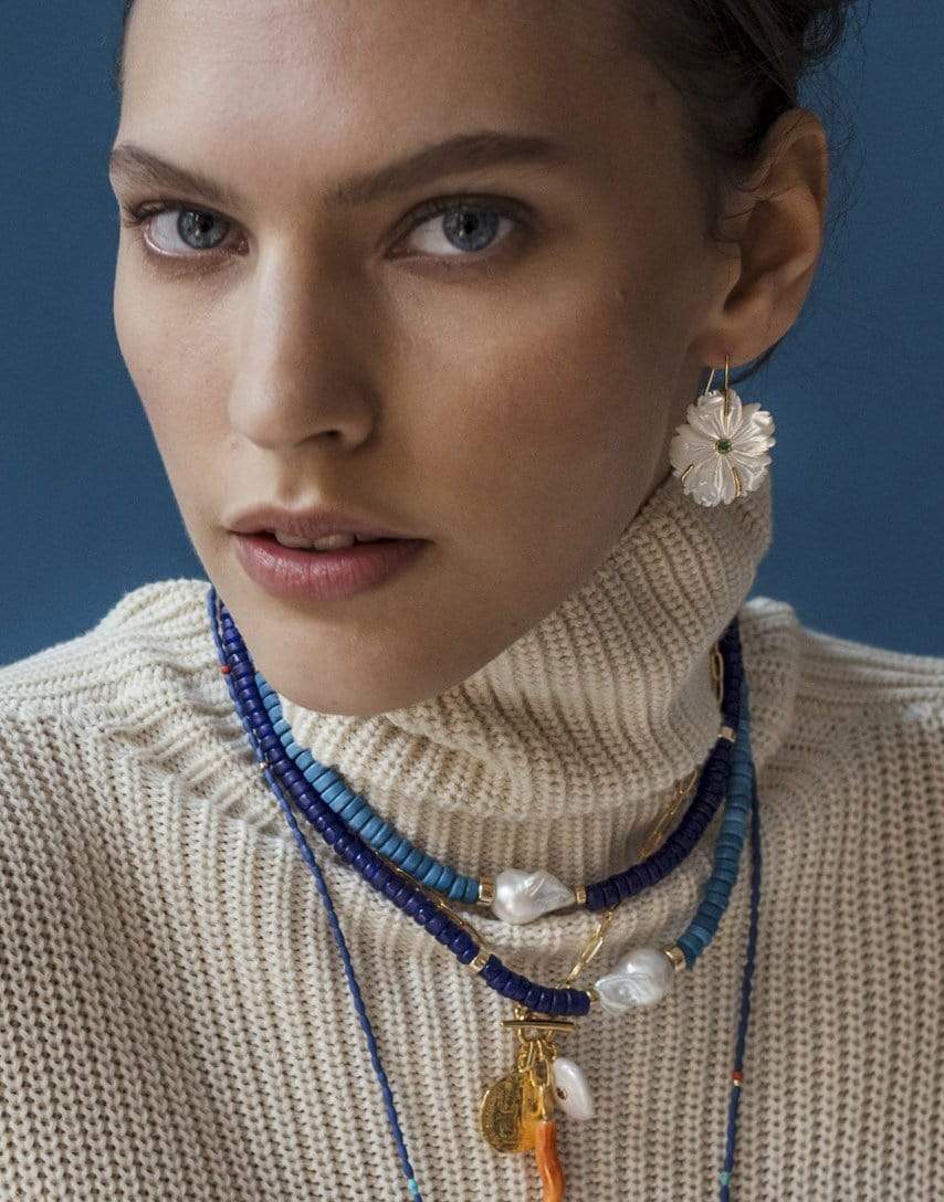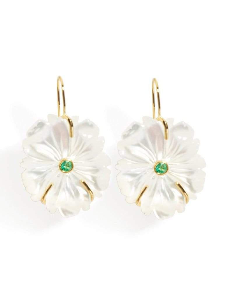 Lizzie Fortunato new bloom earrings in pearl. The New Bloom Earrings in gold vermeil are our perennial pick for everyday illumination. With radiant carved mother-of-pearl flowers inset with faceted precious emerald stones.