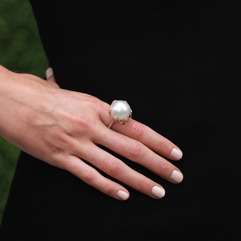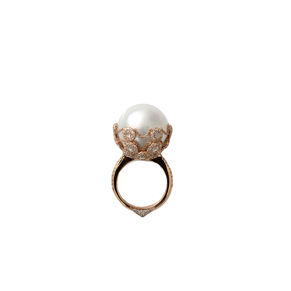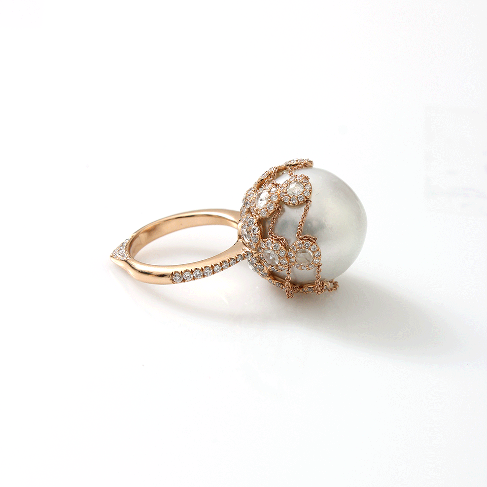 Pearl Ring With Rose Cut And Diamond Pave And Chain Detail From Inbar