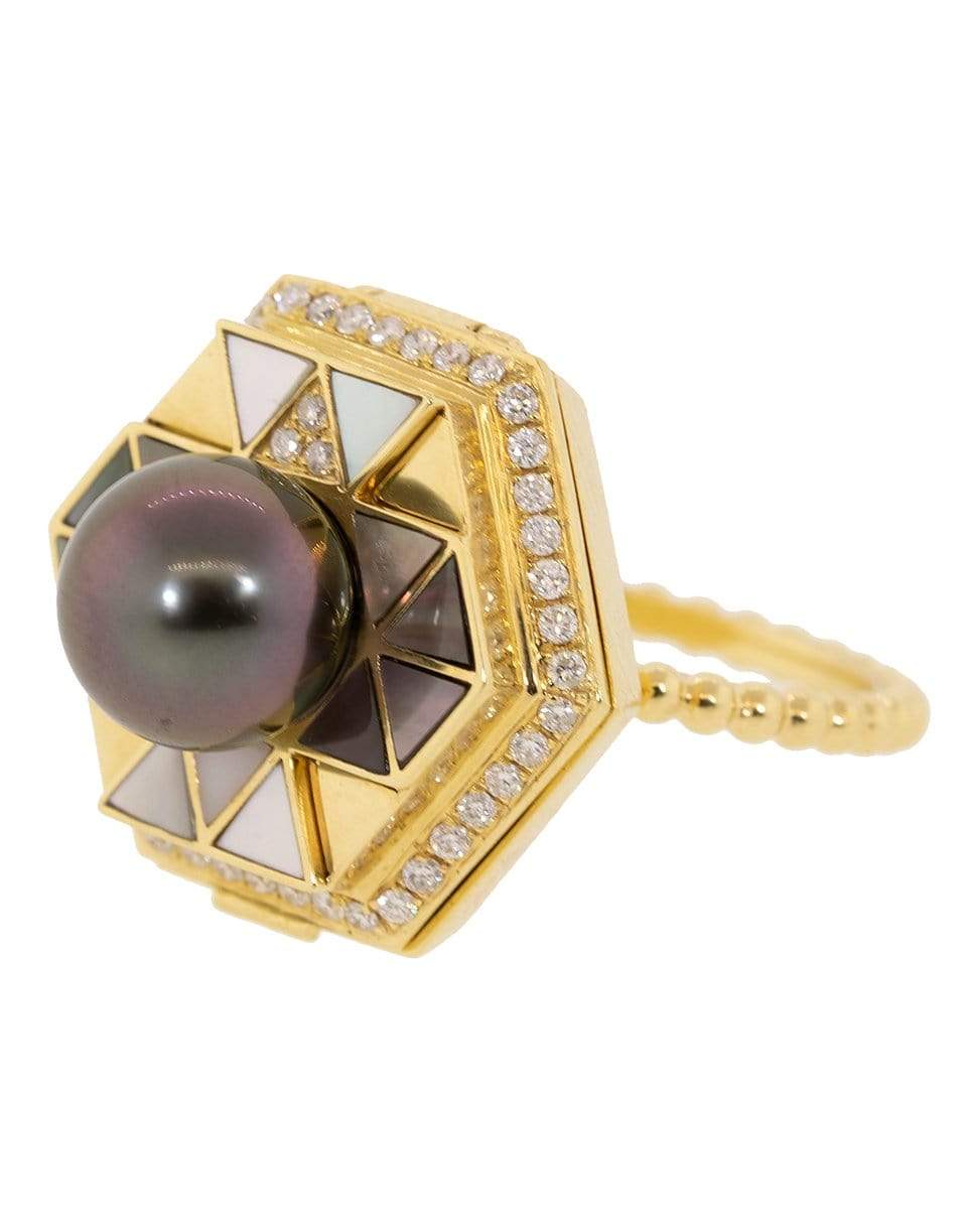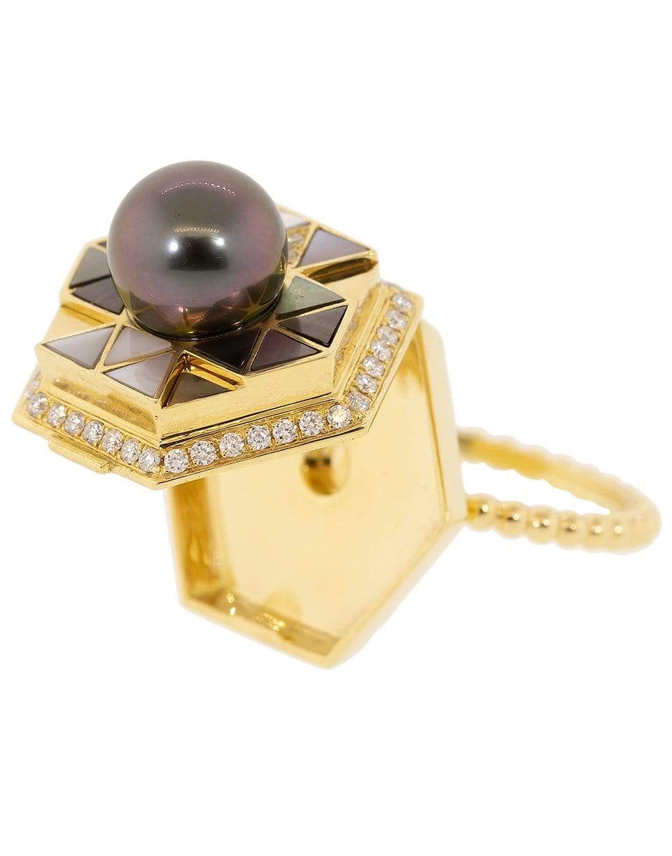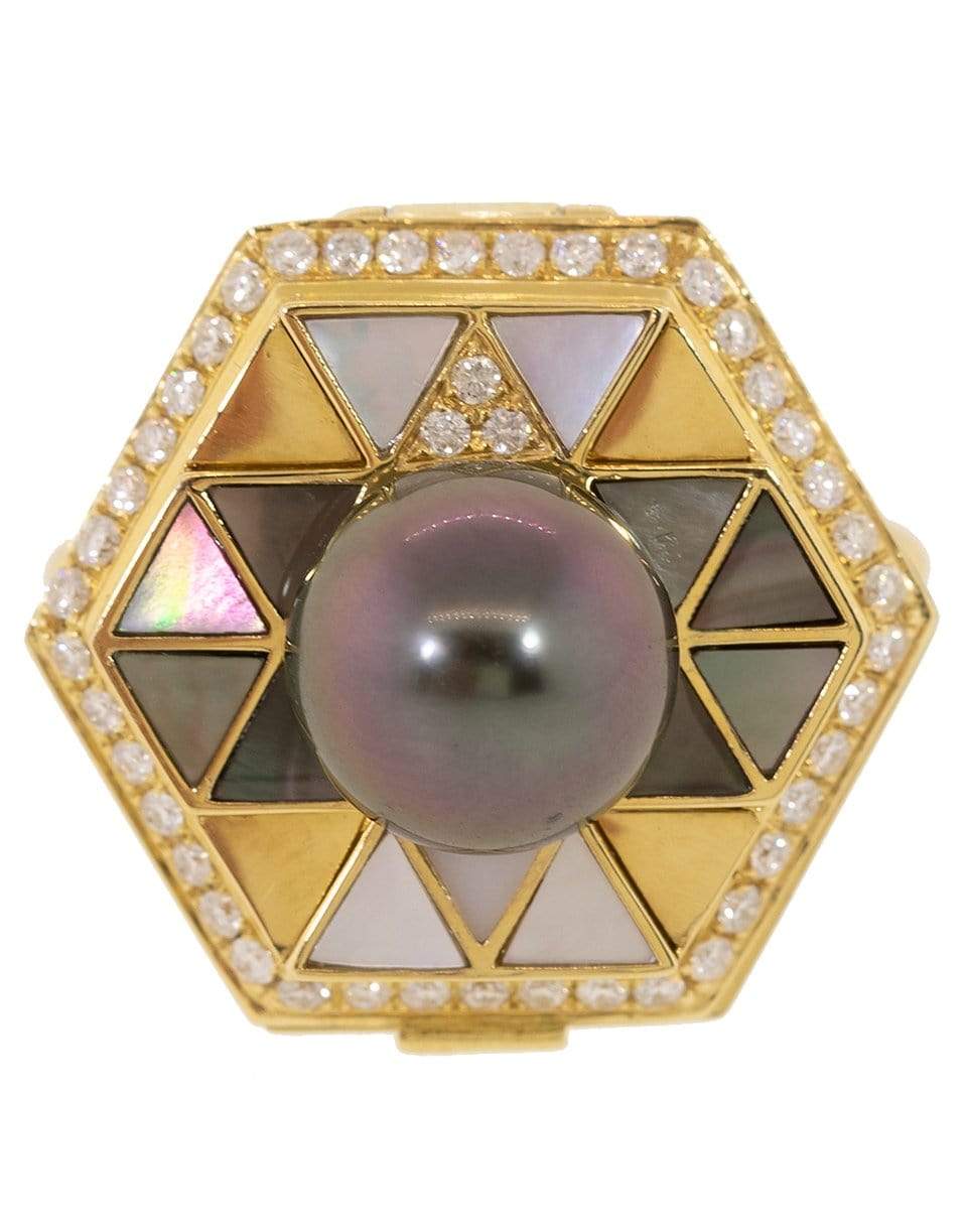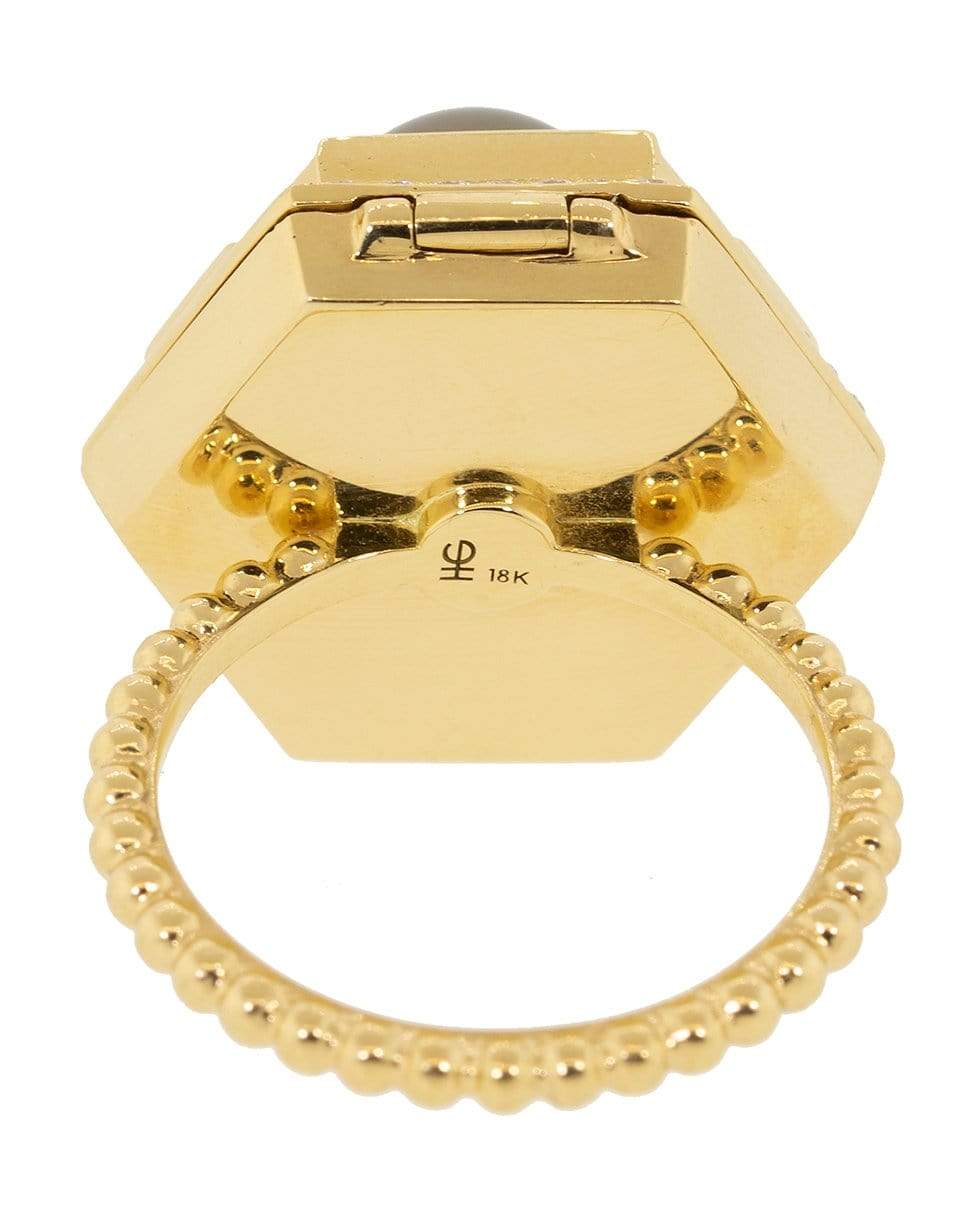Harwell Godfrey mother of pearl and diamond Poison Ring with a pearl top.