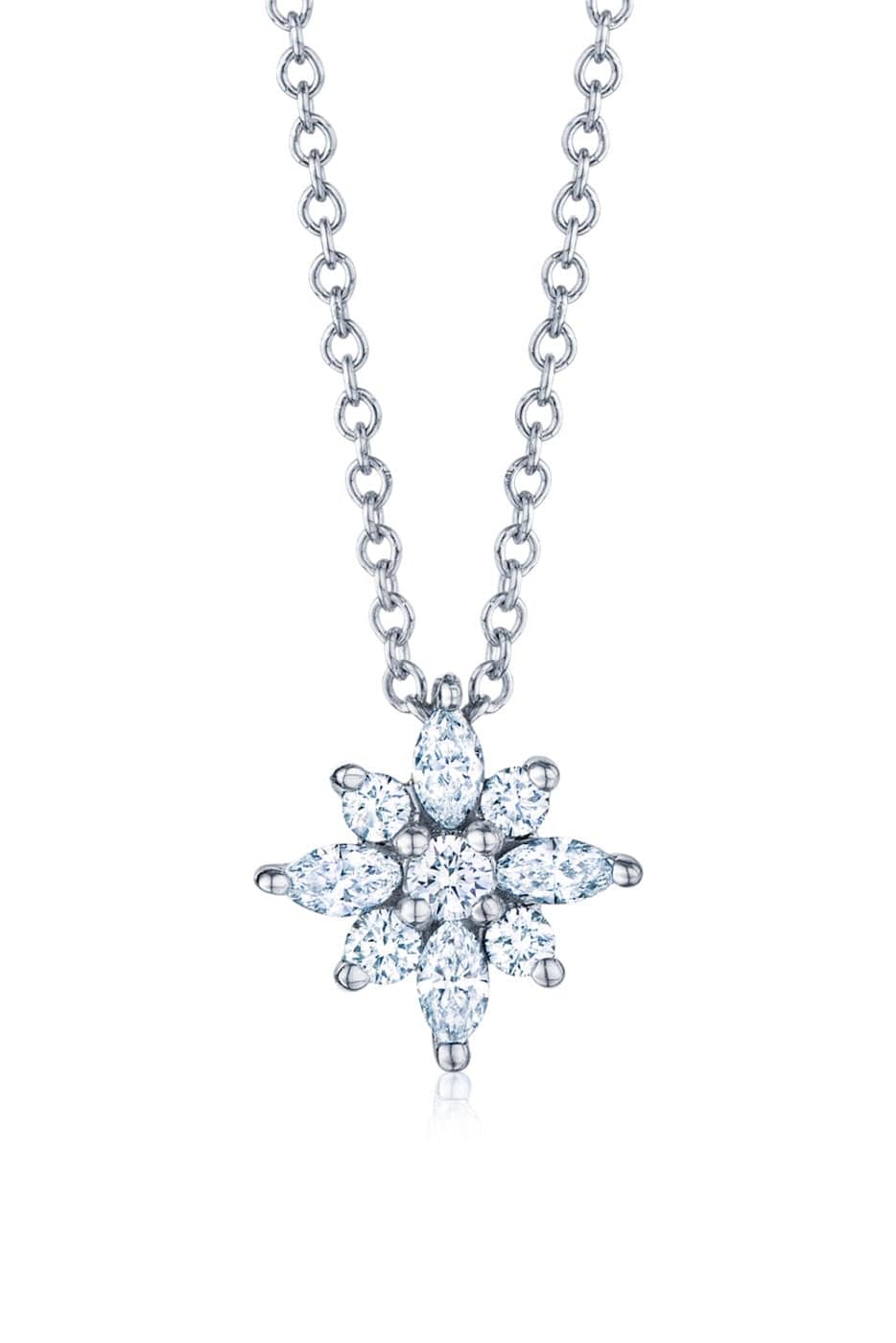 Kwiat petite diamond star necklace. Star-shaped clusters twinkle with celestial beauty in this elegant, effervescent collection. Here, marquise and round brilliant diamonds intermix in a scintillating pendant. Kwiat artisans engineer the 18k white gold design to lay flat without twisting or flipping over, using minimal metal to maximize light flow into the diamonds.