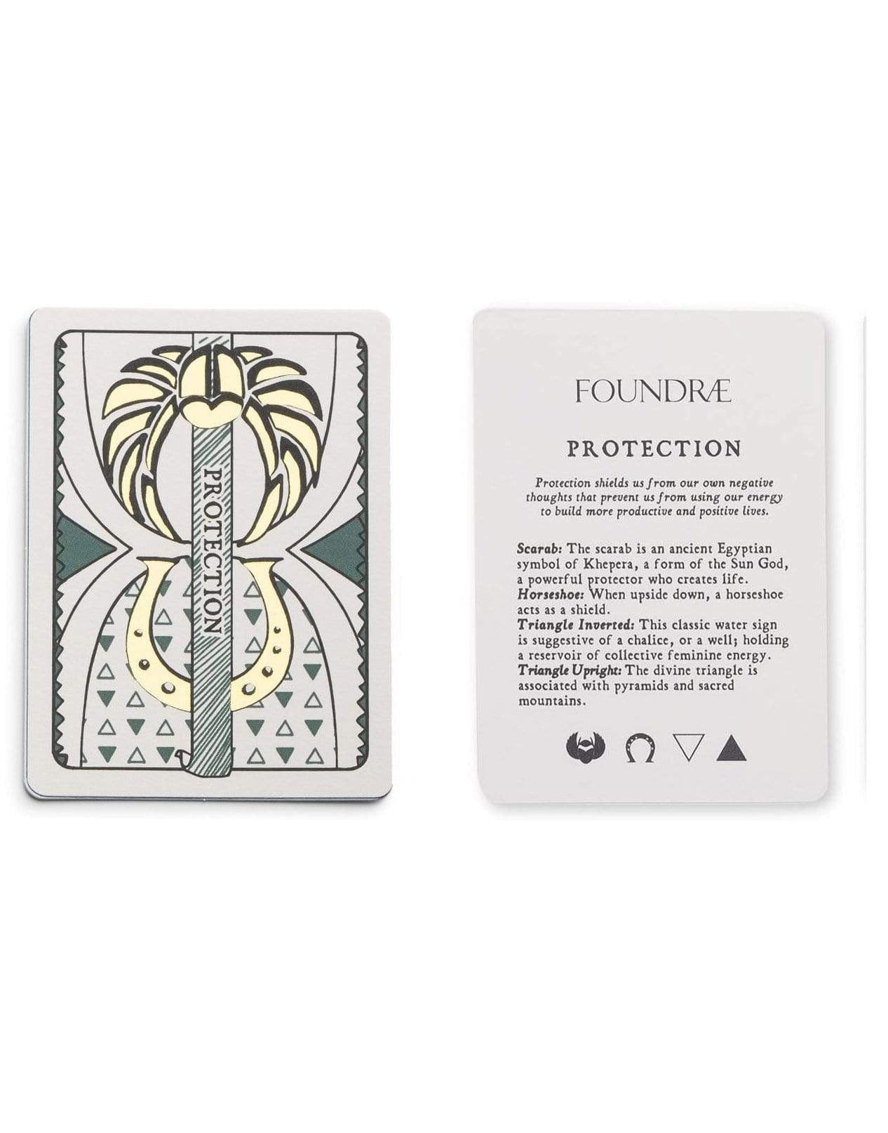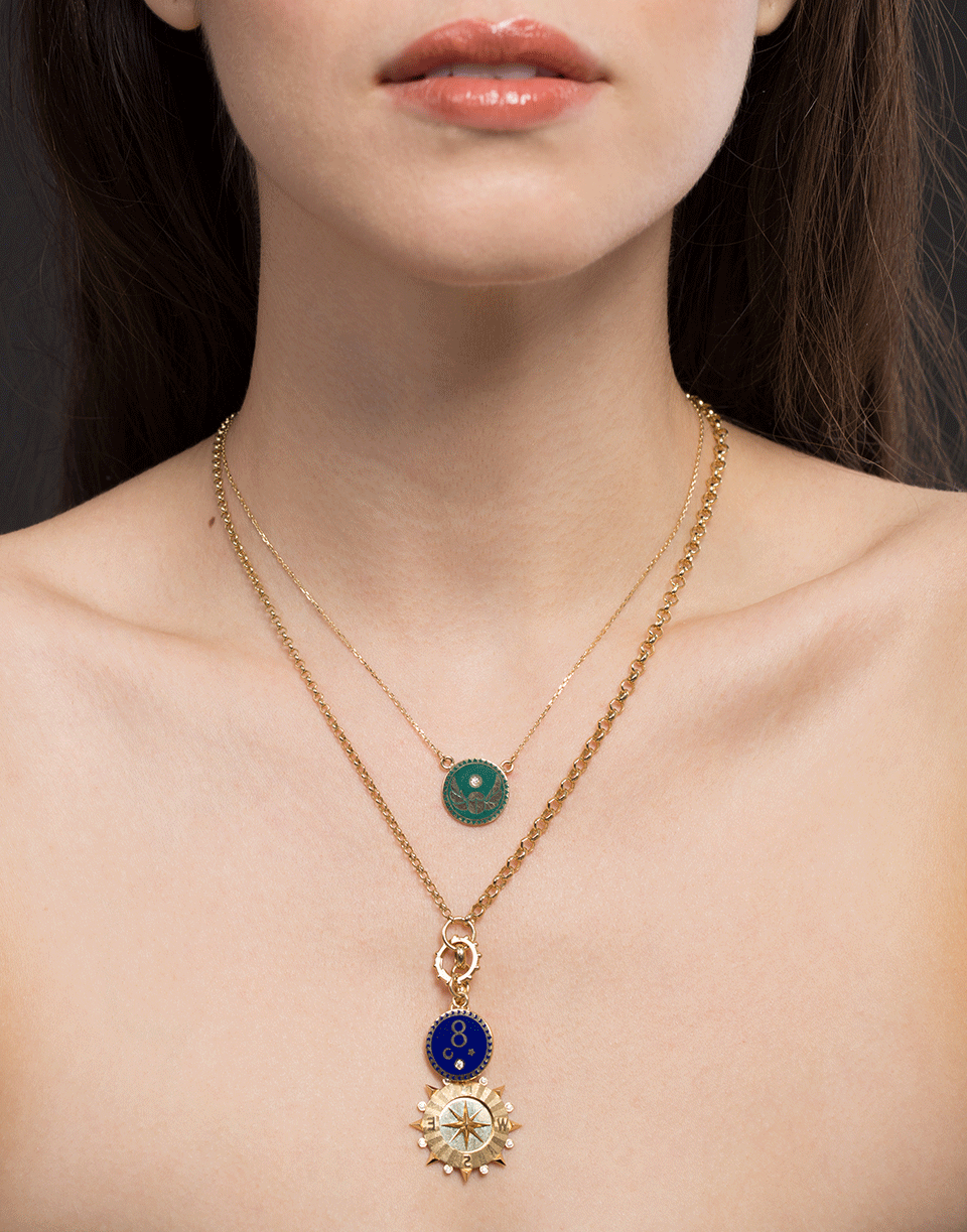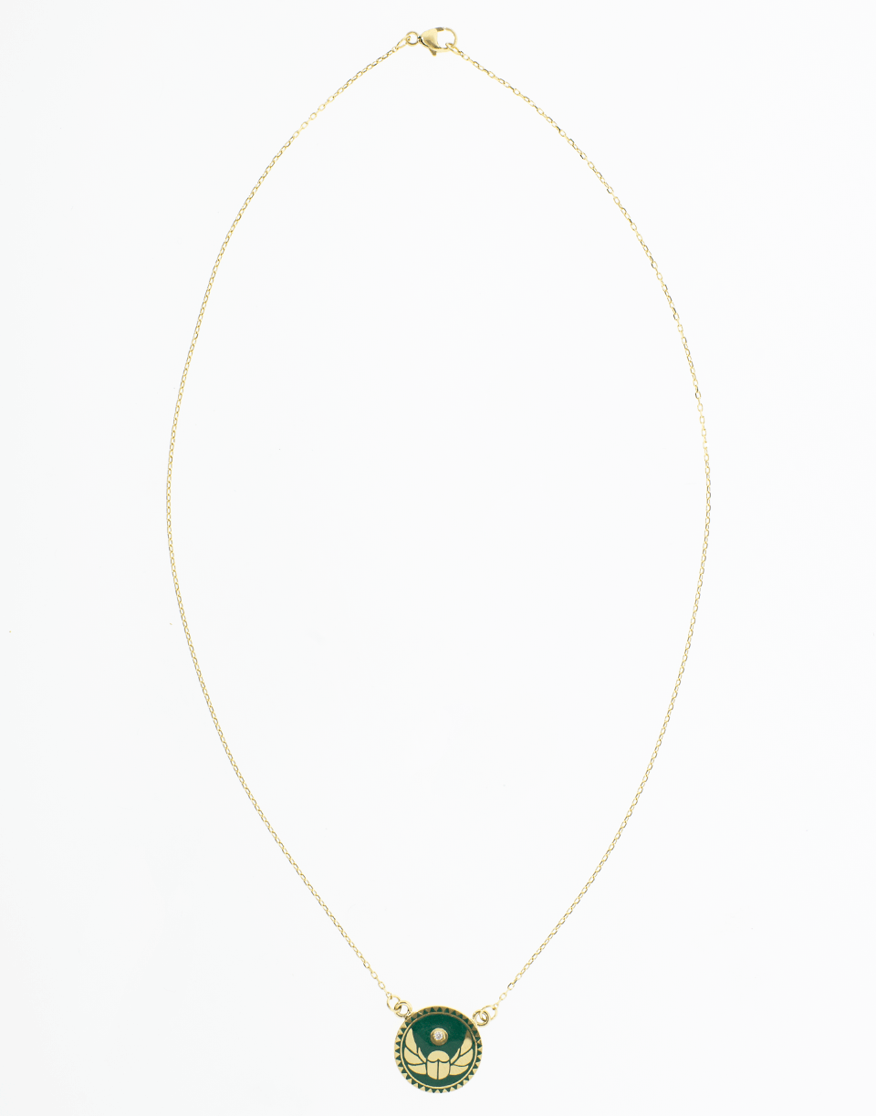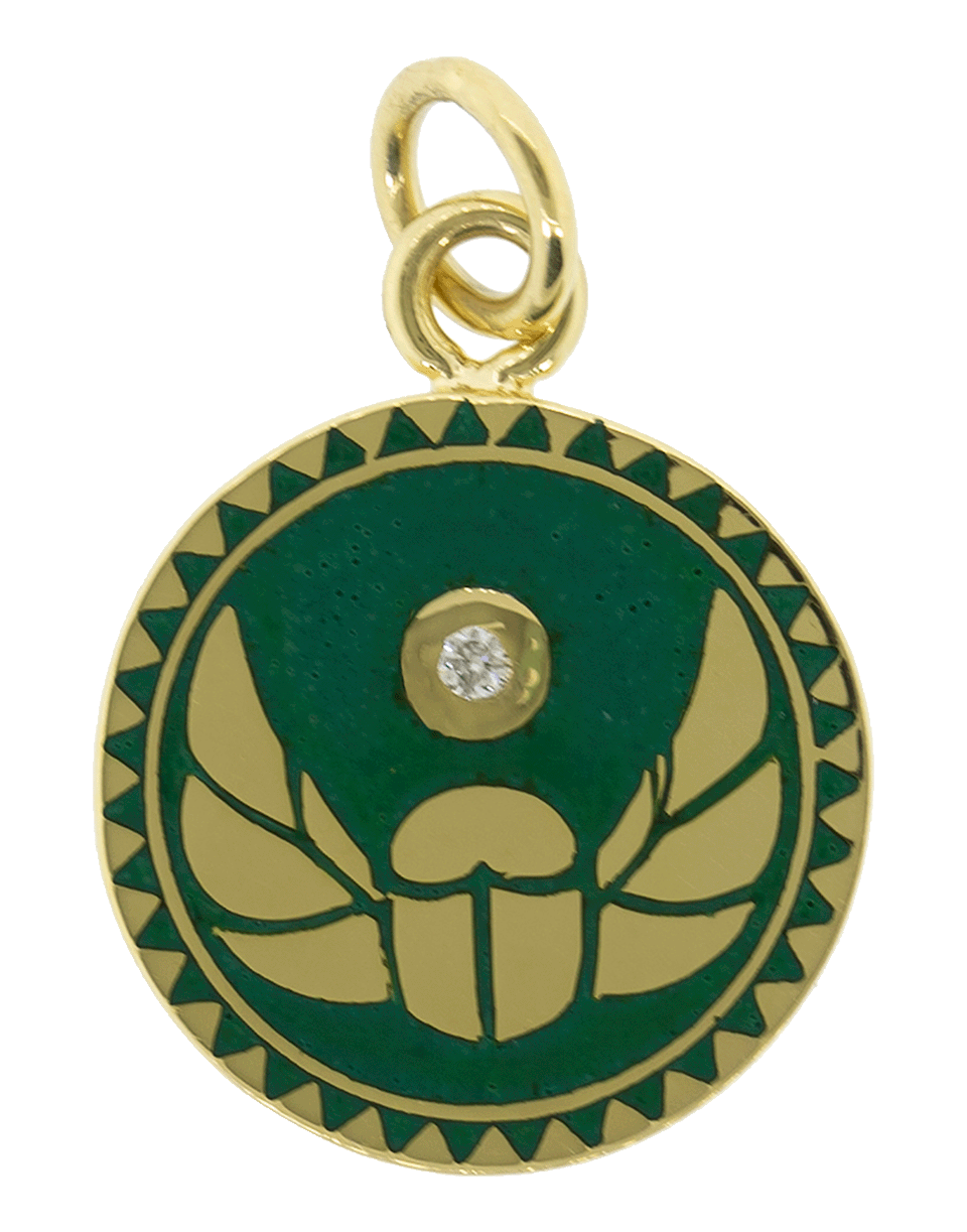 Foundrae's petite protection medallion is designed with polished green champlevé enamel, a single diamond, and a Scarab- an ancient protective symbol developed to shield the wearer from their own negative thoughts.
