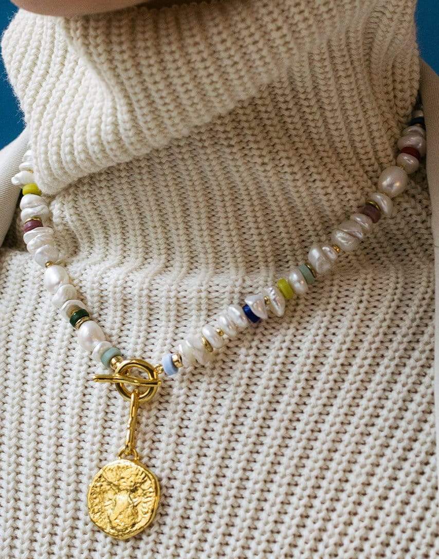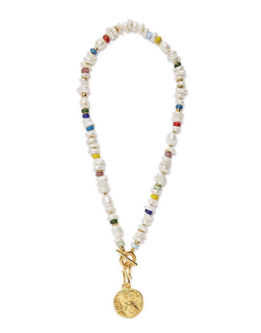 Lizzie Fortunato petra coin necklace. A party-ready strand finished with a cast antique coin pendant, the Petra is a perfect mix of modern whimsy and timeless, old-world charm. With multicolored glass and freshwater pearl beads and gold-plated toggle closure.