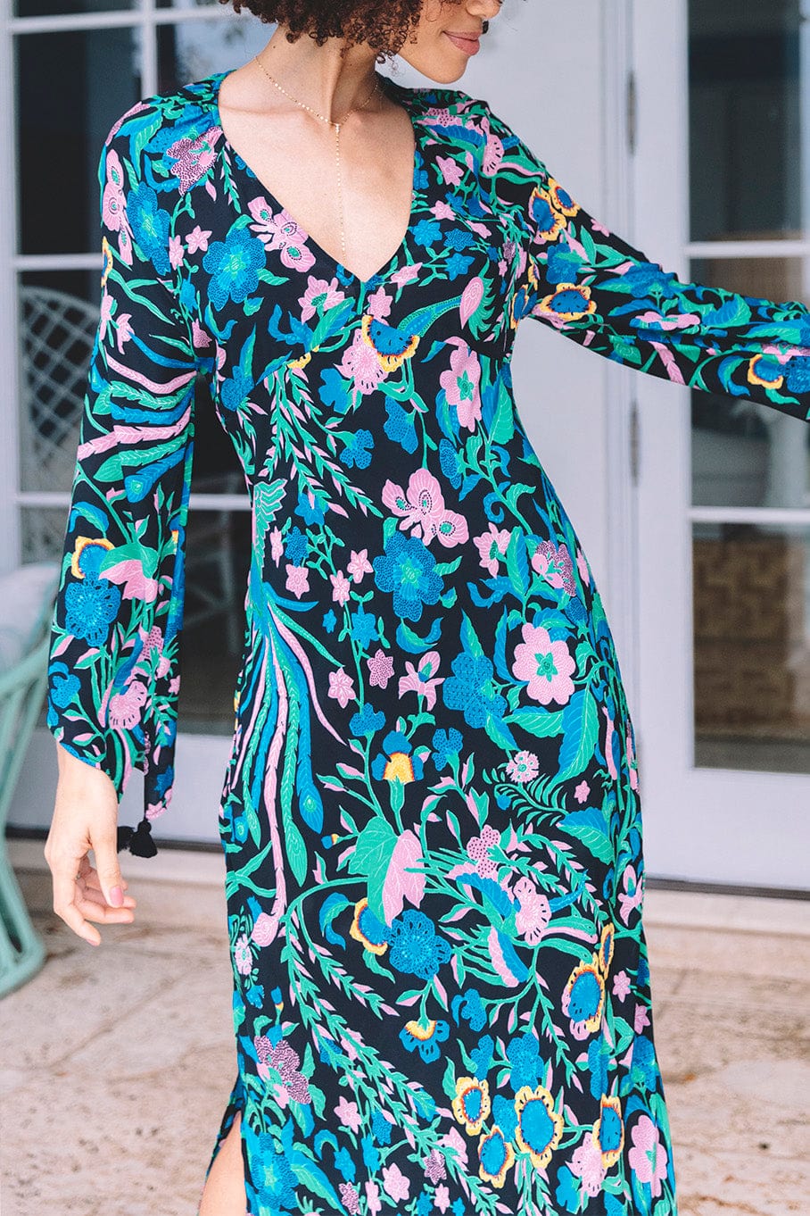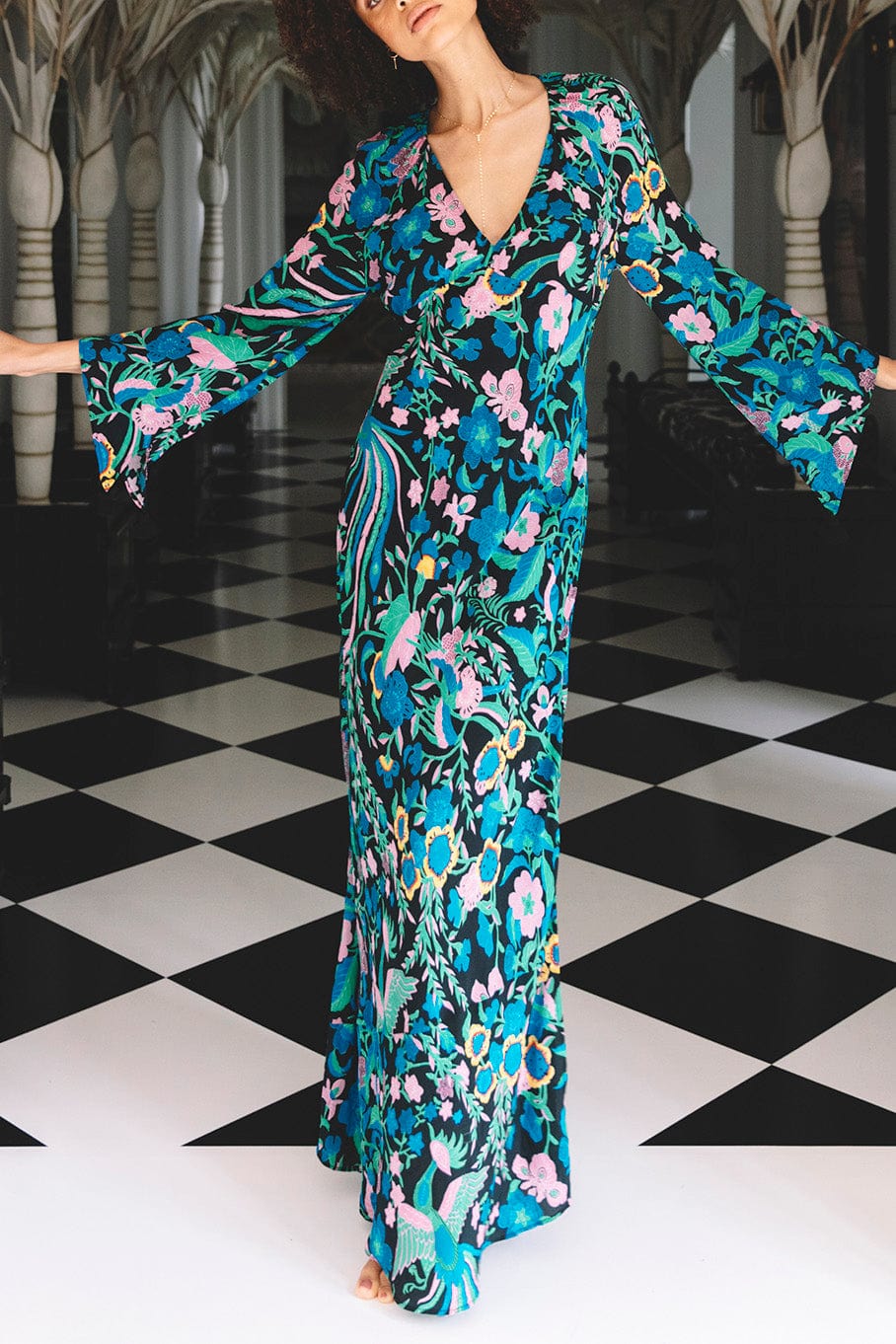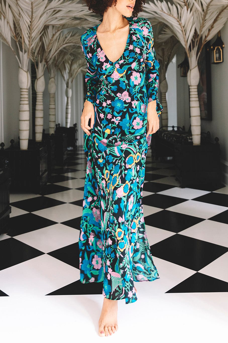 Figue peyton dress in birdsong black. The trick to Peyton is her simplicity. She may look like just another deep V-neck long dress but don't be fooled. Cut on the bias, this silhouette gently skims the body in one of the most universally flattering ways we have ever seen.