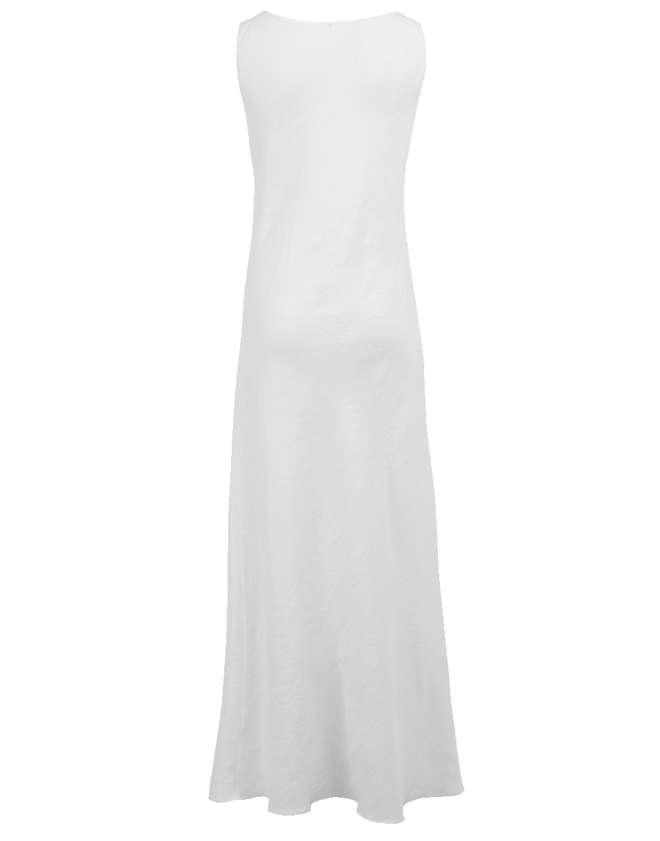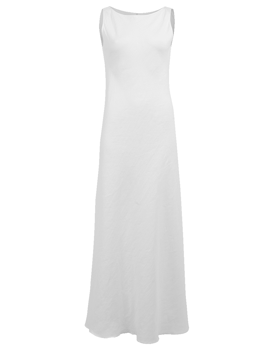 Ivory ‘Pillar’ dress by Peter Cohen. This lightweight linen blend slip dress features a sleeveless cut with a boat neckline and a maxi length.