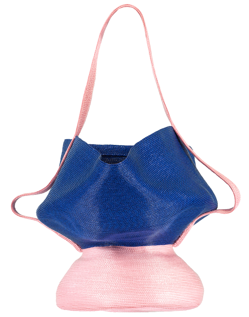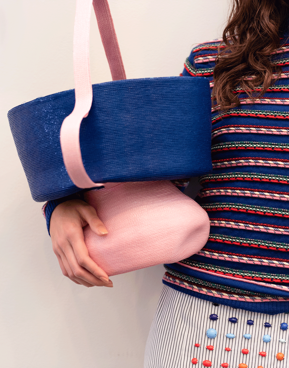 This pink and blue Jug bag from Rosie Assoulin features two stacked color blocked tiers connected with a single 8” top handle, making it easy to access all your essentials.