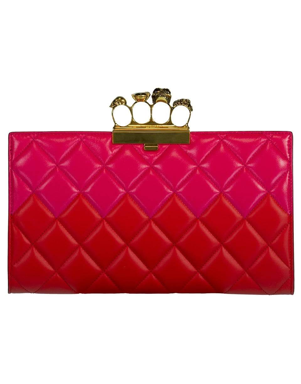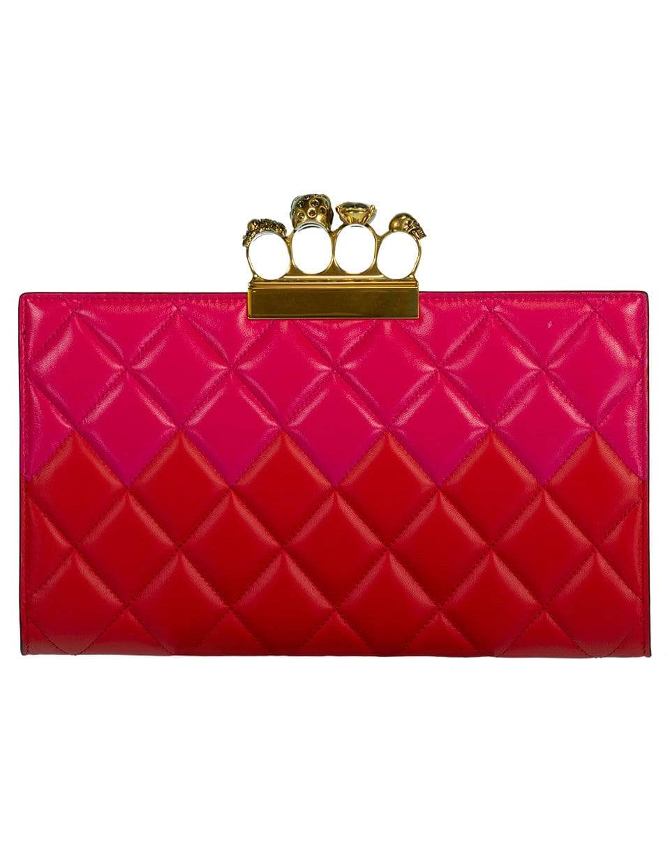 Pink and red four ring knuckle clutch by Alexander McQueen featuring a quilted design with a clasp closure, interior zip pockets, and goldtone hardware. Finshed with a four-ring detail on top.