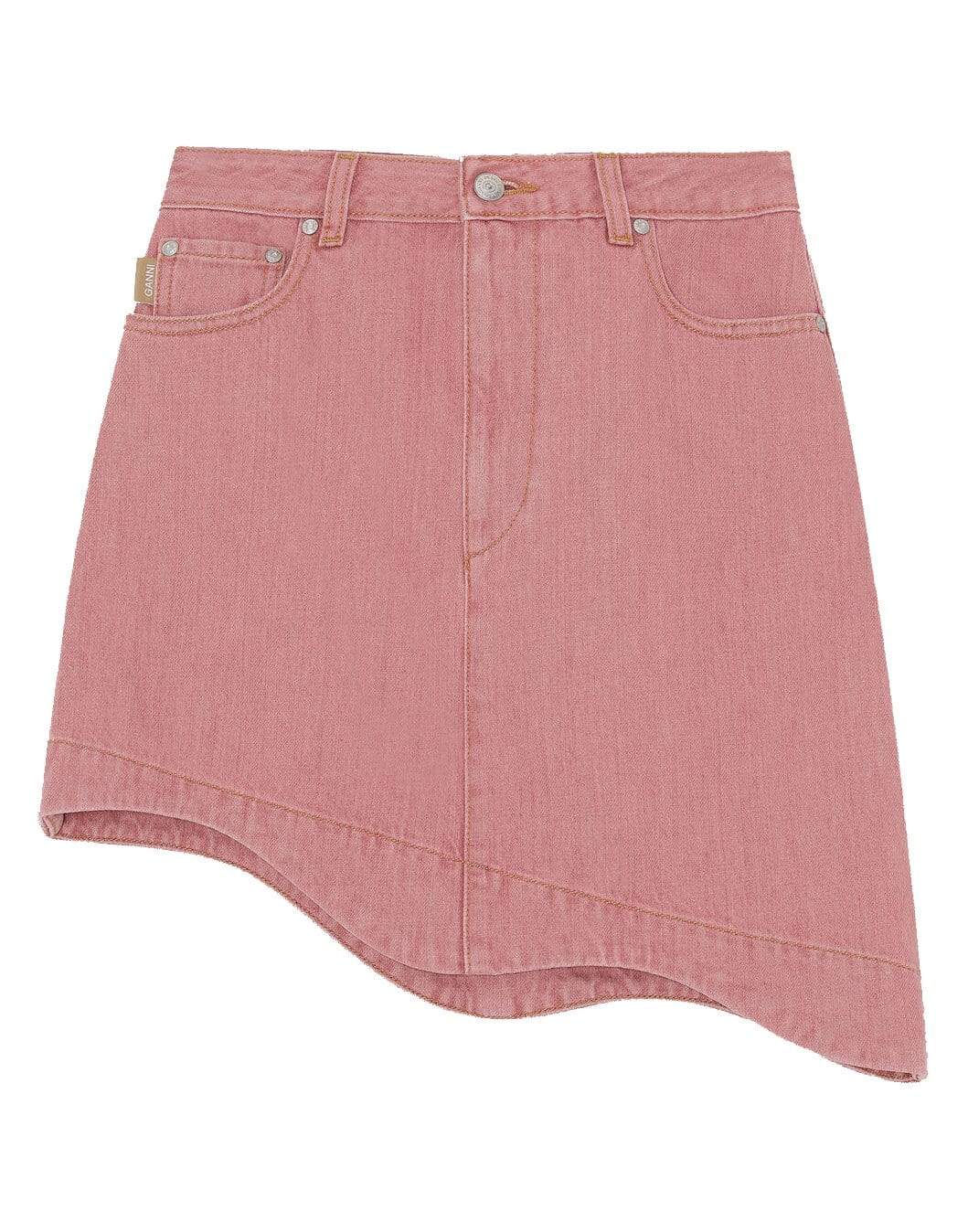 Ganni yarn dyed denim skirt. High-waisted washed pink denim mini skirt, finished with a wavy, asymmetrical hemline.