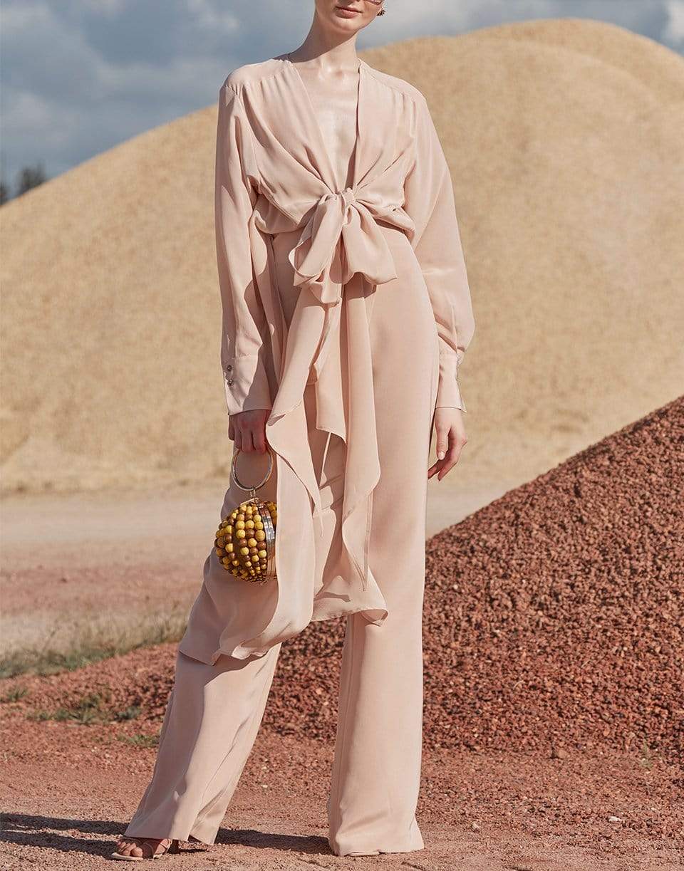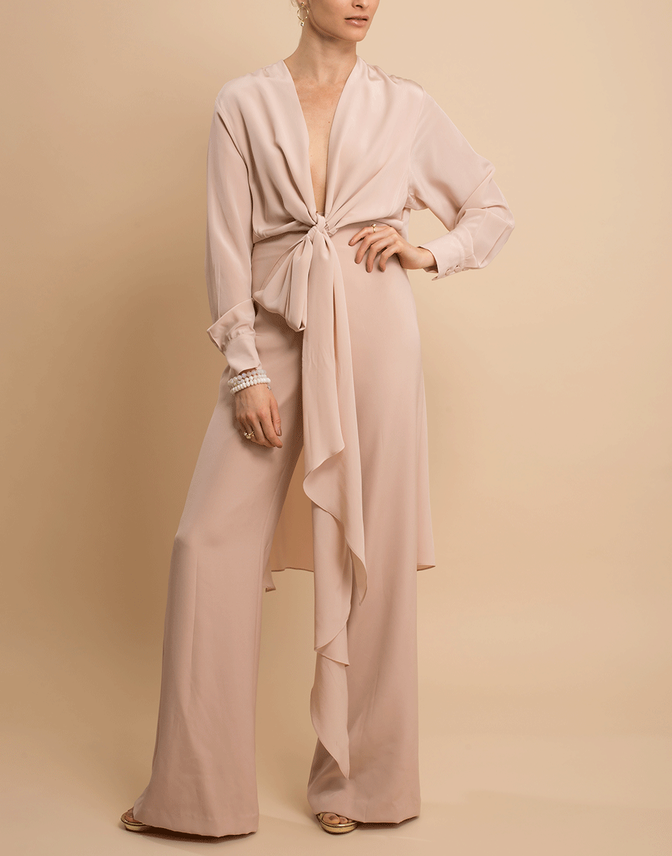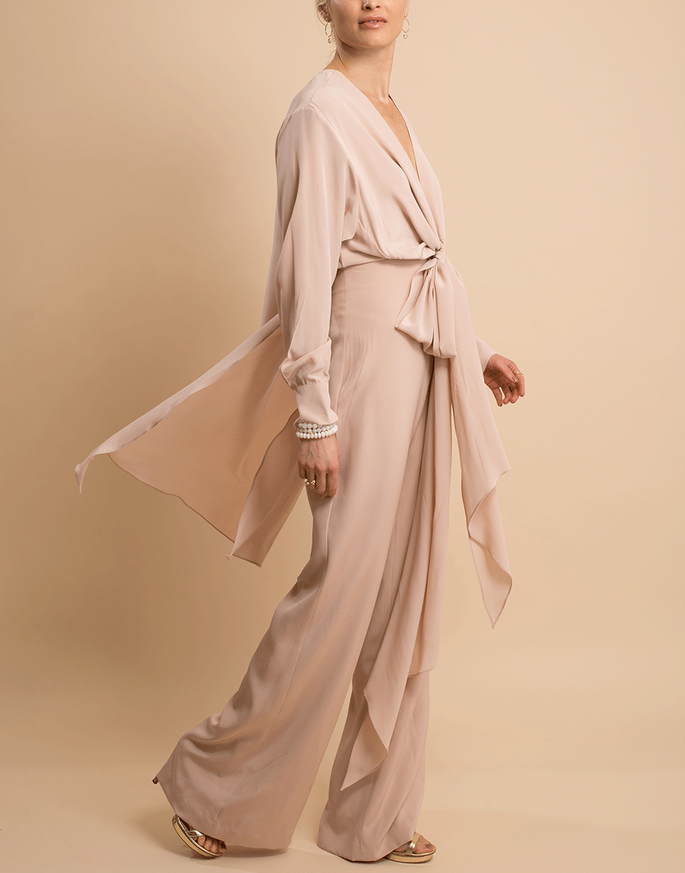 Silvia Tcherassi stretch silk Heidy jumpsuit with plunging V-neck, ties at waist, long sleeves, and a relaxed leg. Finished with a lightweight cape detail at back.