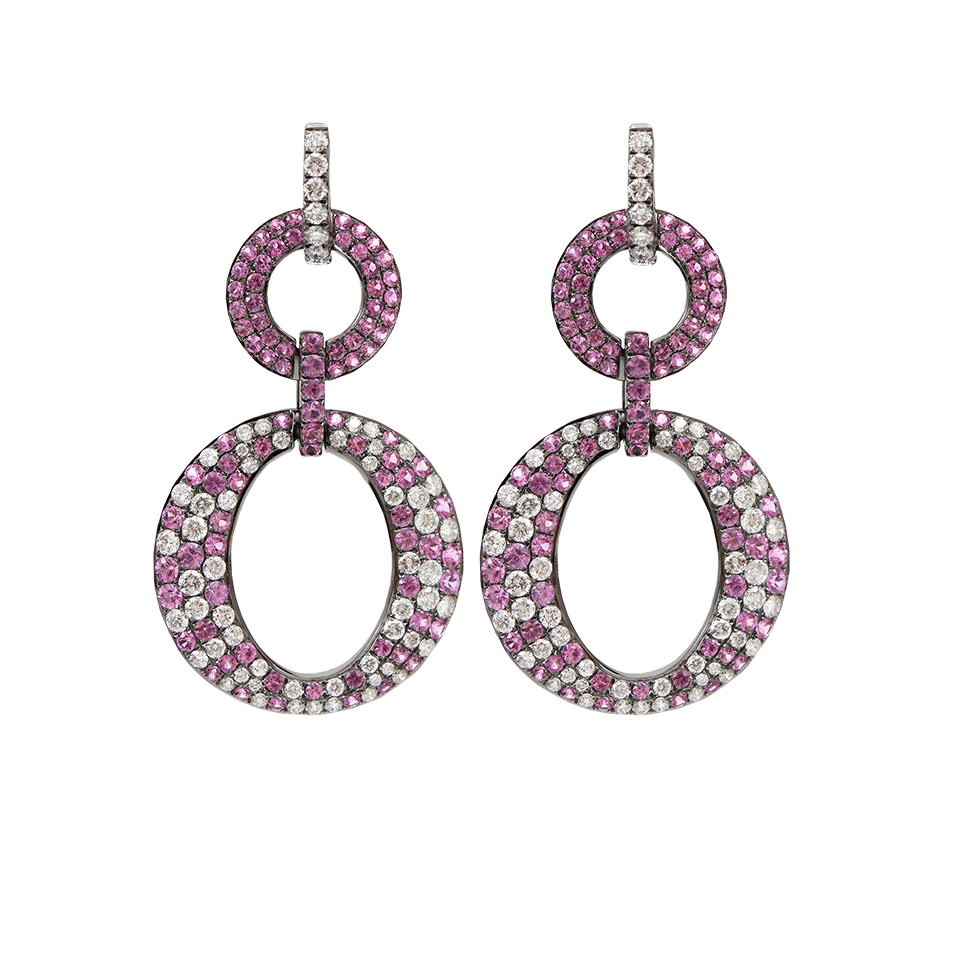 Let your ears shimmer in style and timeless beauty with Bochic's pink sapphire double "O" drop earrings.