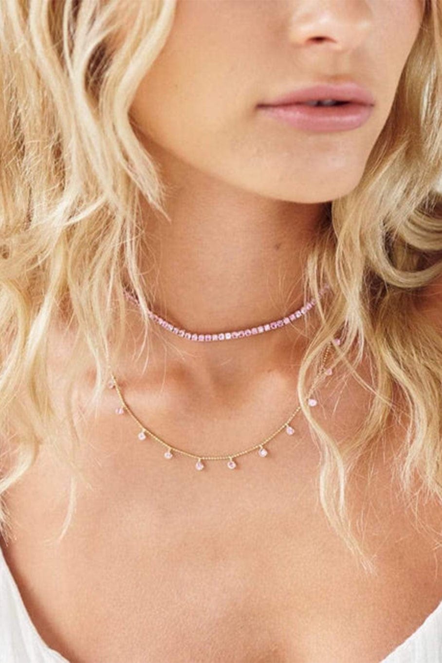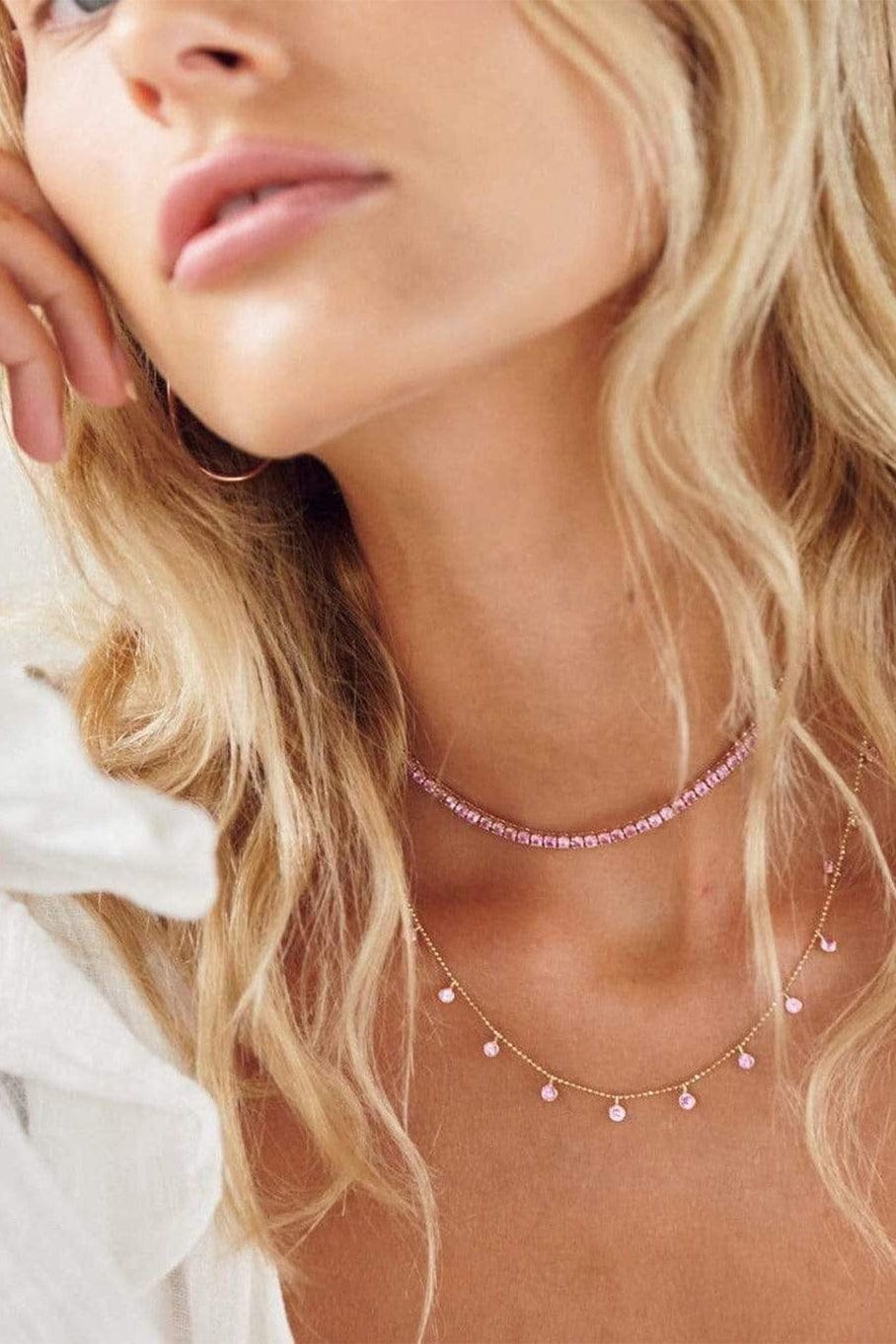 Henri Noel pink sapphire drop station necklace. A fun take to our classic Drop Station Necklaces. Add a pop of color to your layering necklace game.