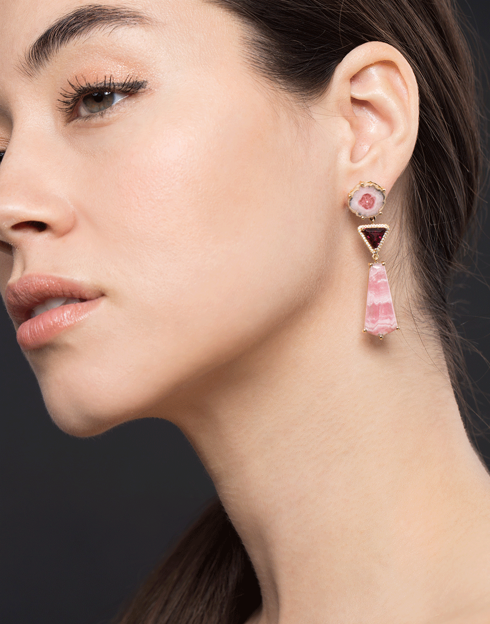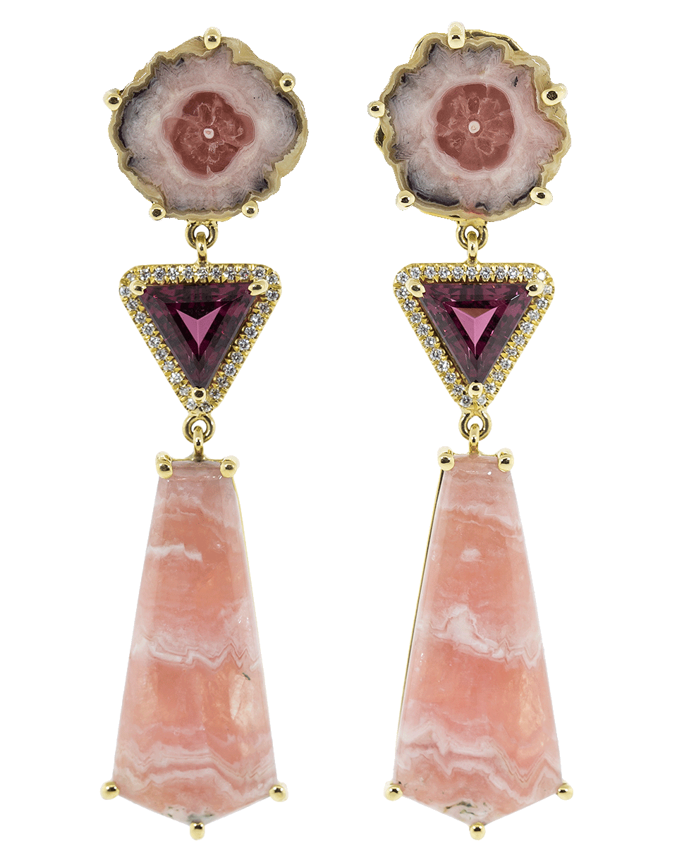Stunning Guita M three drop earrings with rhodochrosite, tourmaline and diamonds set in 18k yellow gold. For pierced ears.