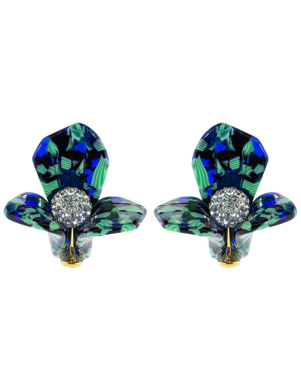 Lele Sadoughi pistachio acetate trillium stud earrings with a three petal flower detail, 10mm crystal pave fireball in the center, and a steel post. For pierced ears.