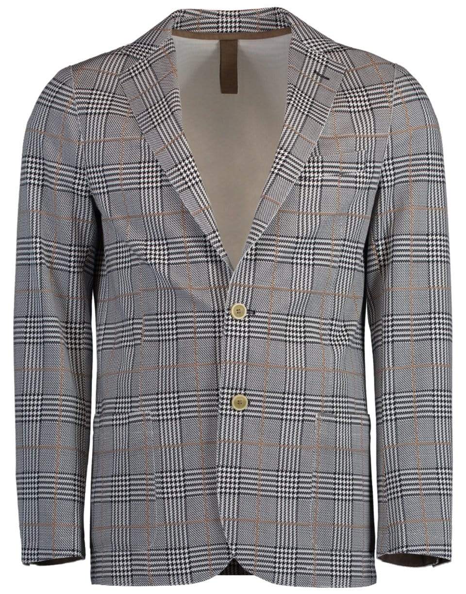 Eleventy single breasted plaid jacket with two front pockets, vented sleeves, and a peak lapel collar.