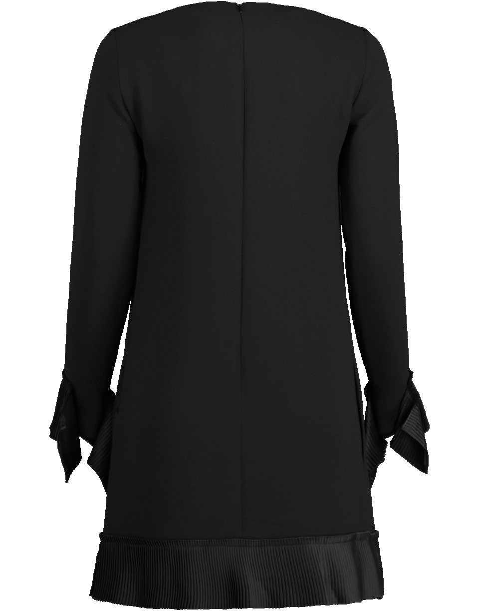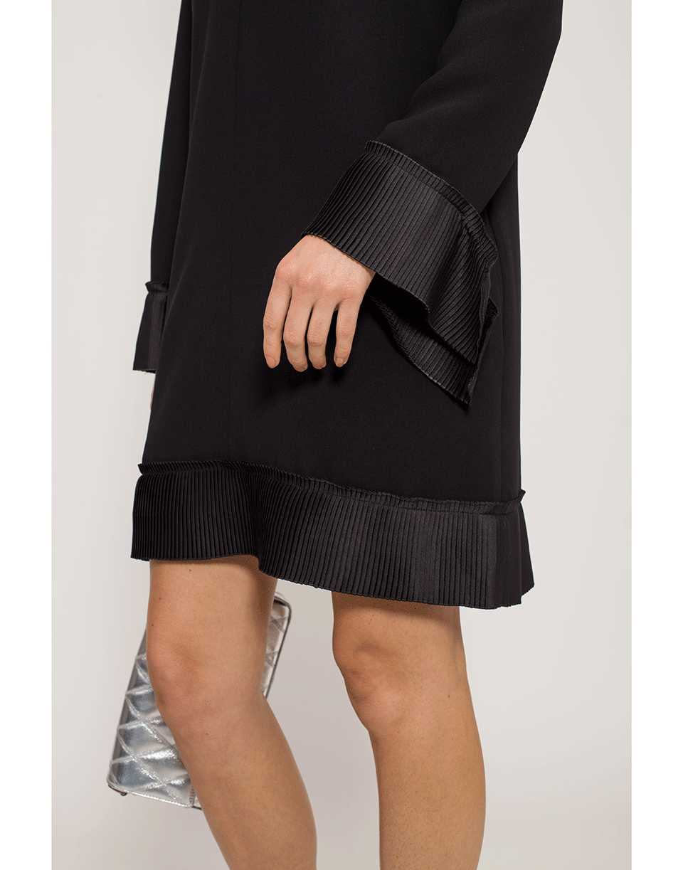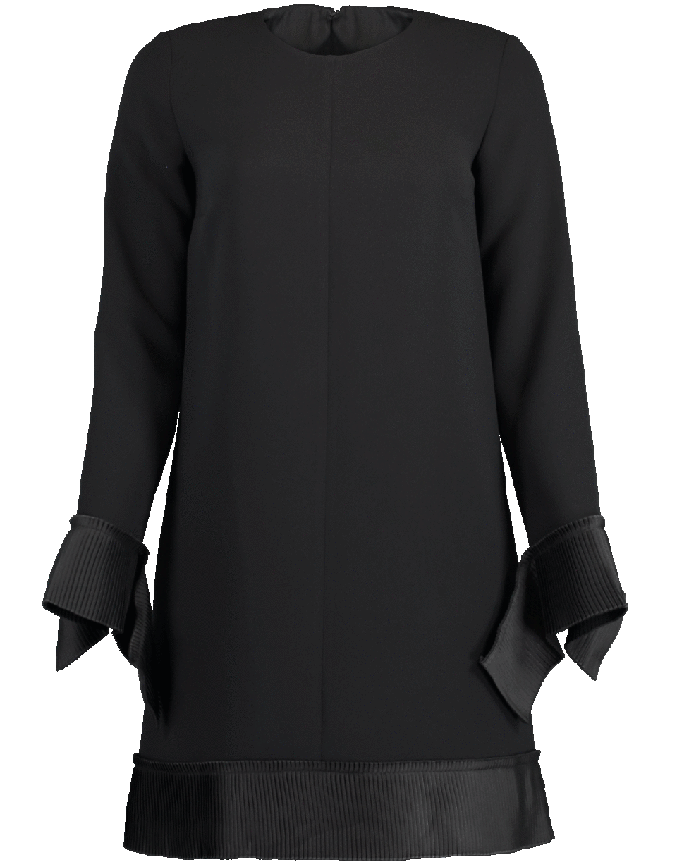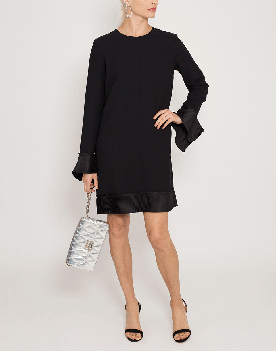 Cut from soft crepe, this Victoria Victoria Beckham knee length dress features a shift silhouette with a round neckline, regular fit, long sleeves with pleated details at cuffs, and a concealed back zip closure.