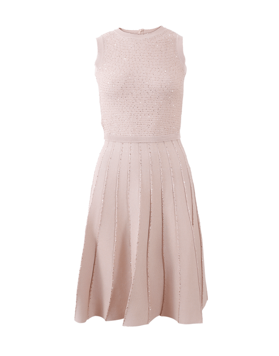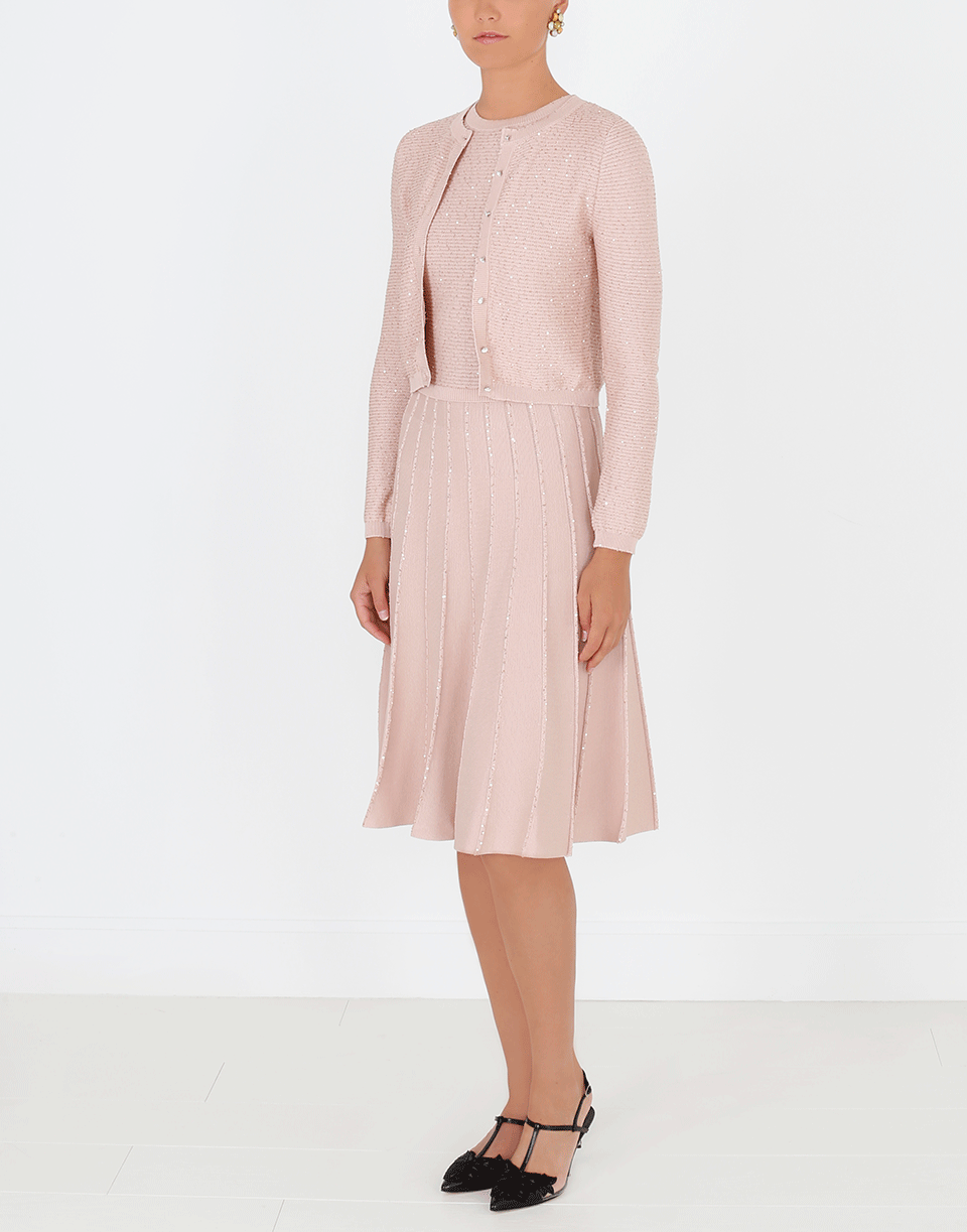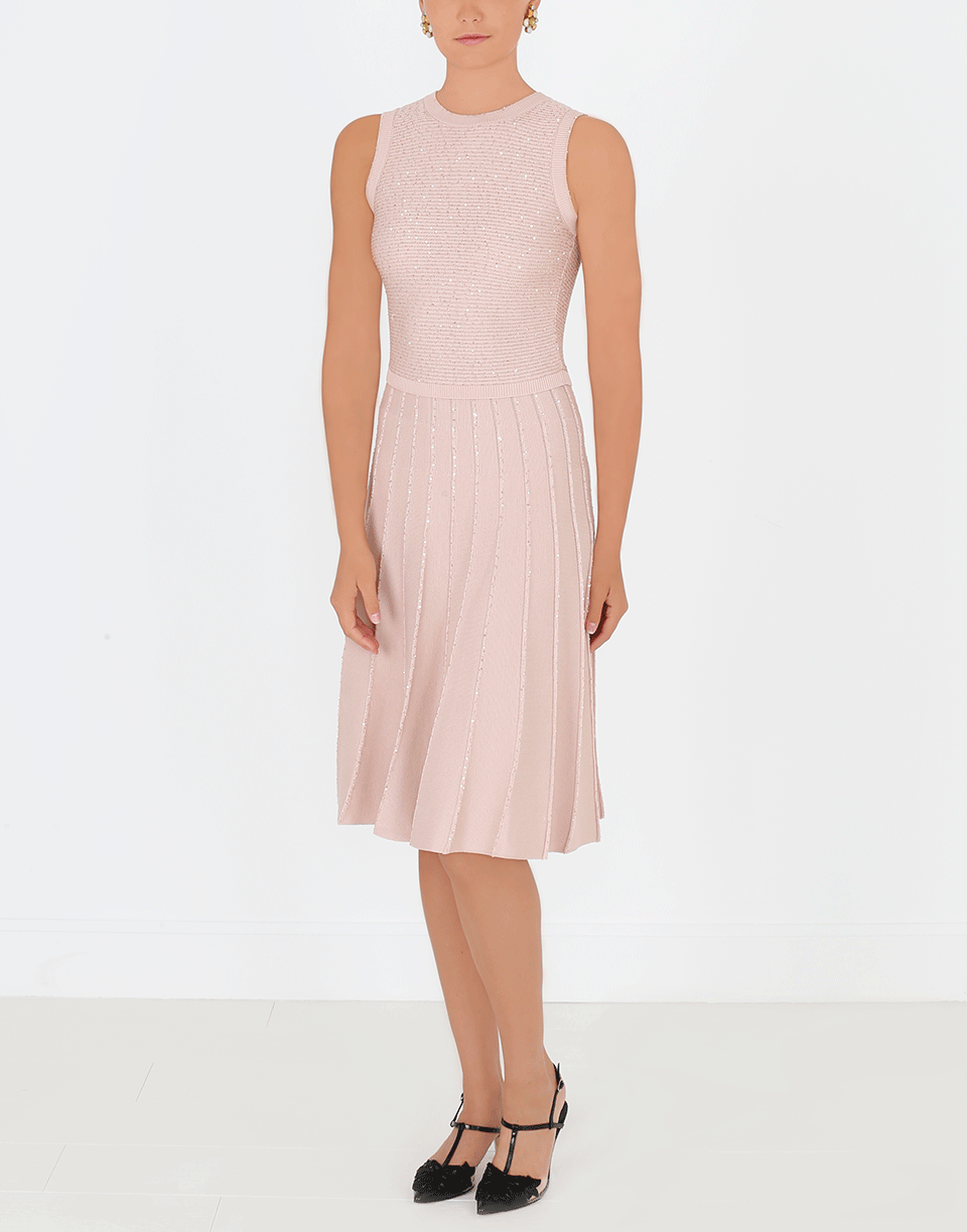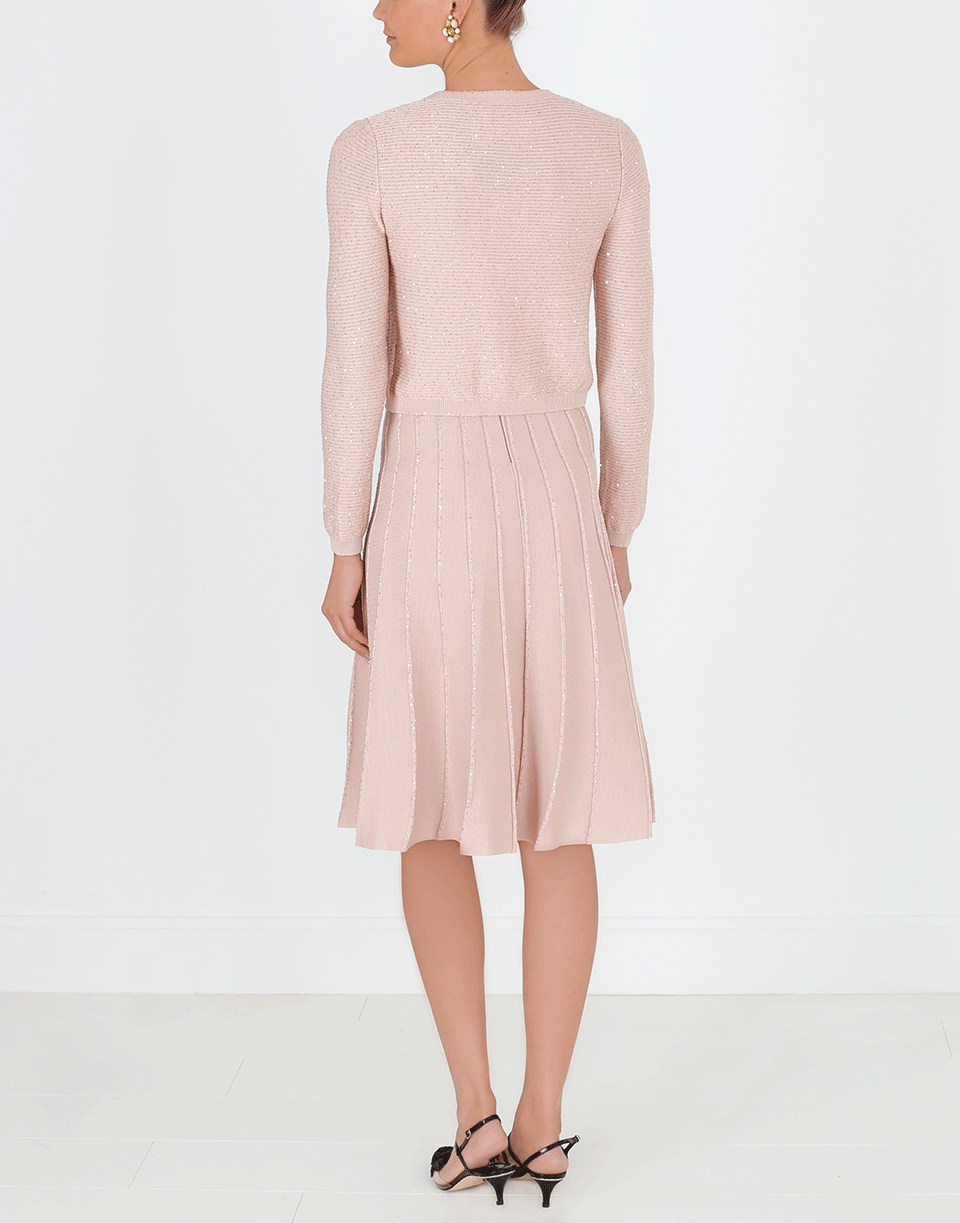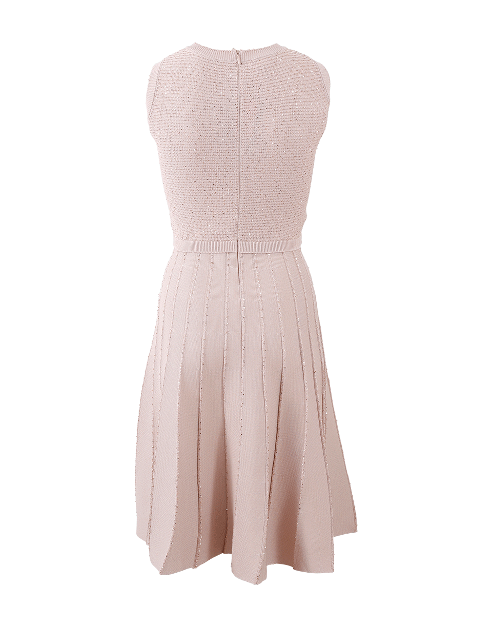 Pleated Full Skirt With Paillette Detail, Slim Fitting Bodice With Knee Length Cut