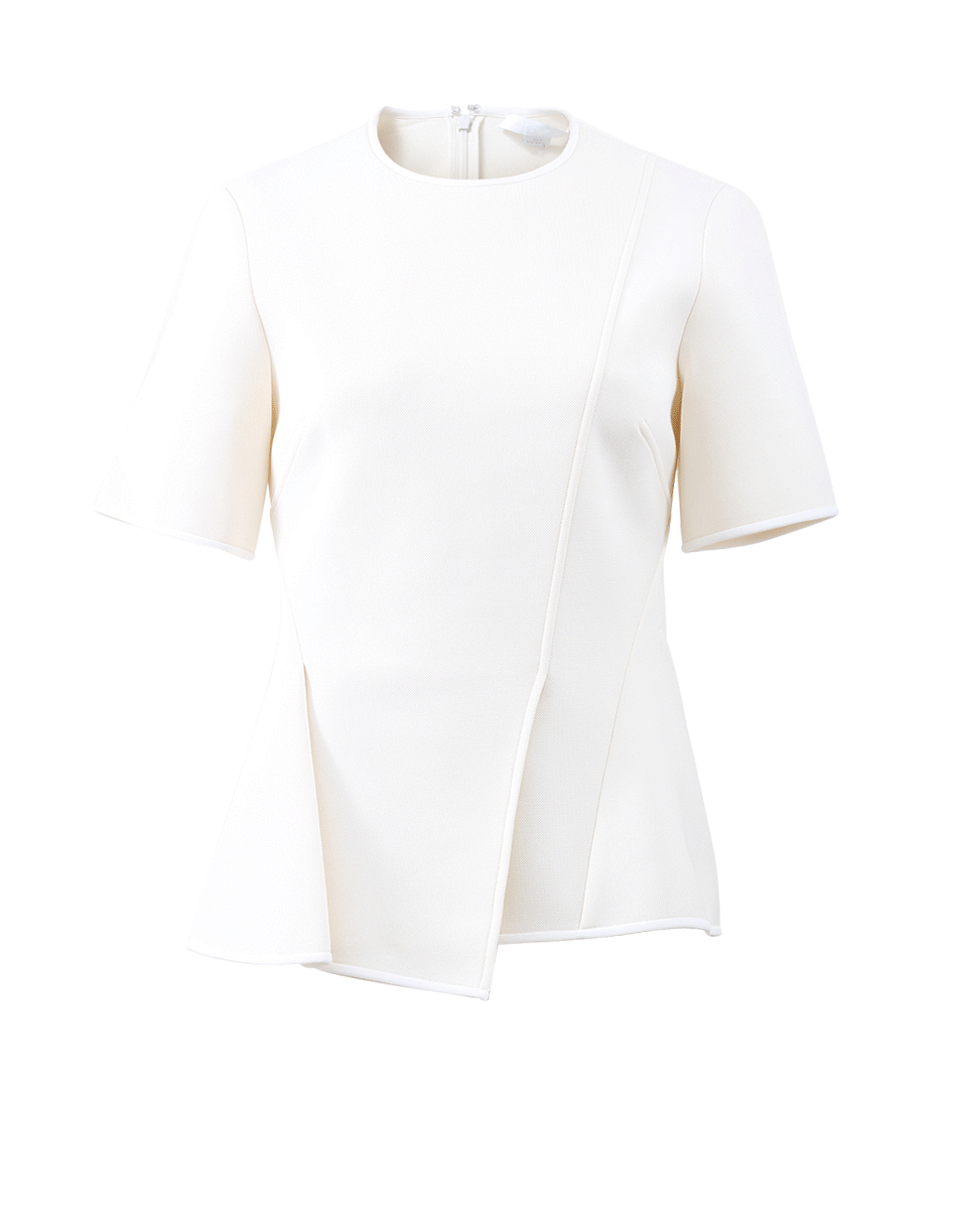 Scoop Neckline With Solid Piping At Neck, Cuffs, And Hem And Asymmetrical Foldover Pleat Detail