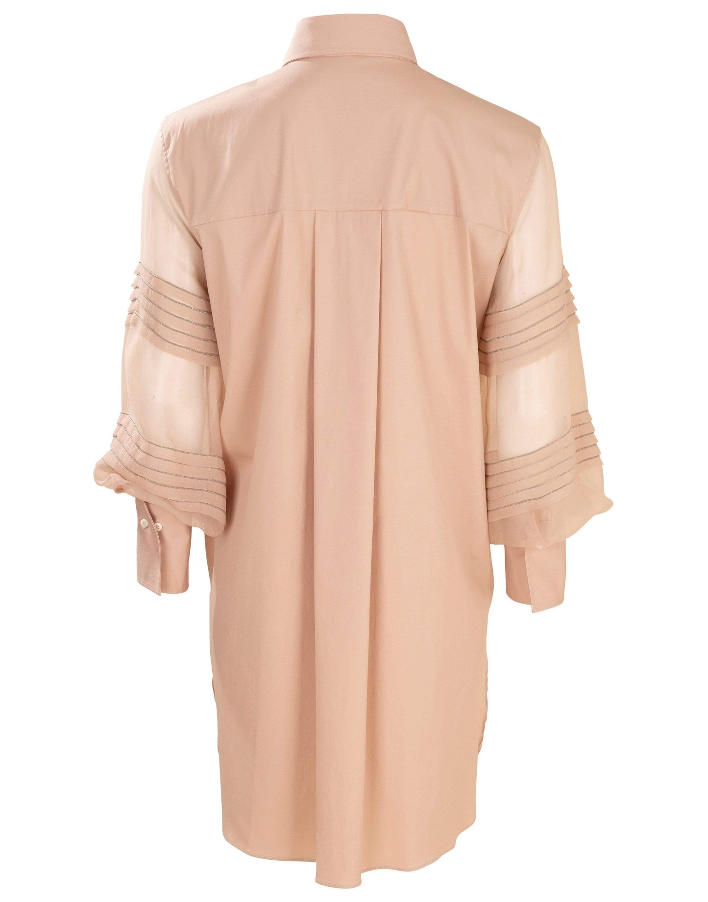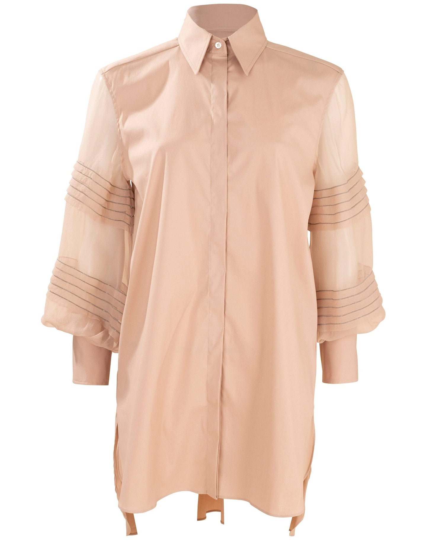 Brunello Cucinelli silk organza blouse with a boyfriend fit, sheer long sleeves, spread collar, and a concealed button placket.