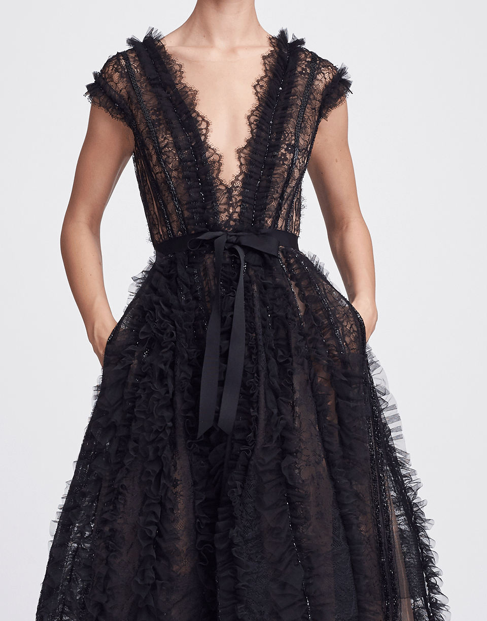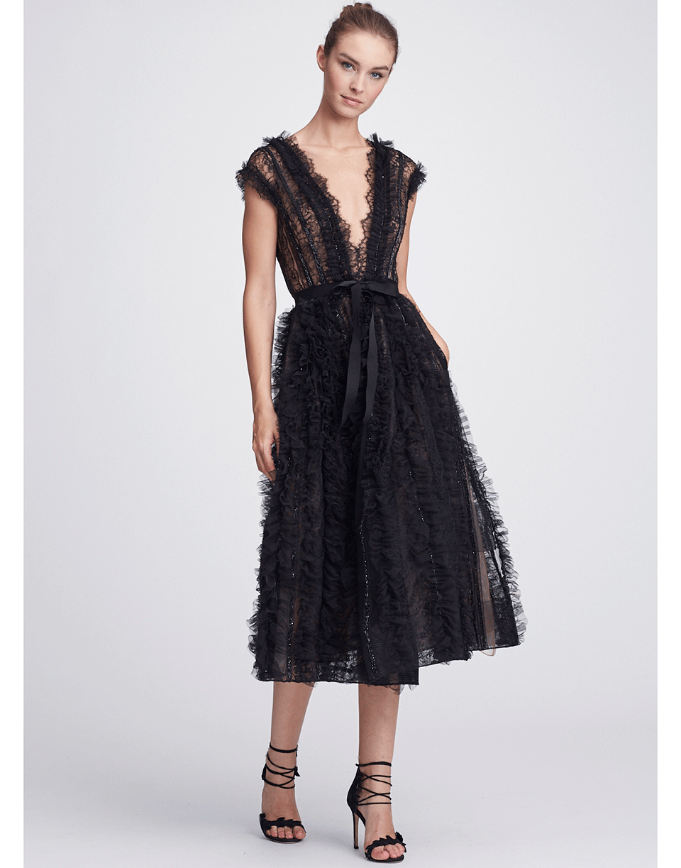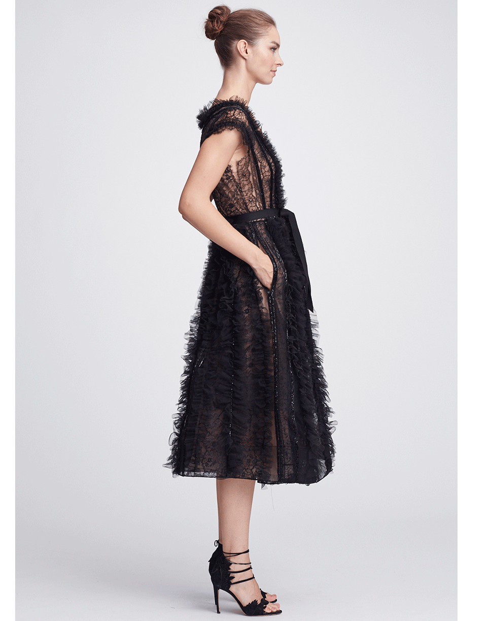 This black tulle flared midi dress by Marchesa features a feminine silhouette embroidered with delicate lace. It offers a dramatic plunging neckline with a round back, cap sleeves, a cinched waist with ribbon tie and side slip pockets.