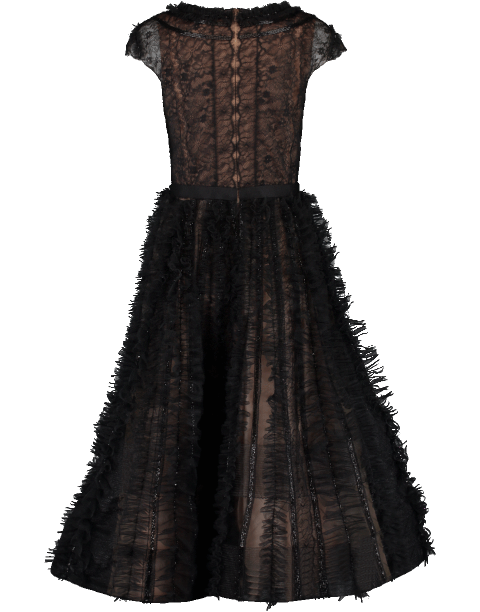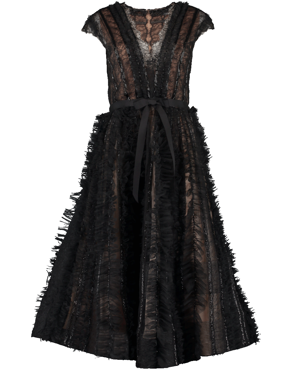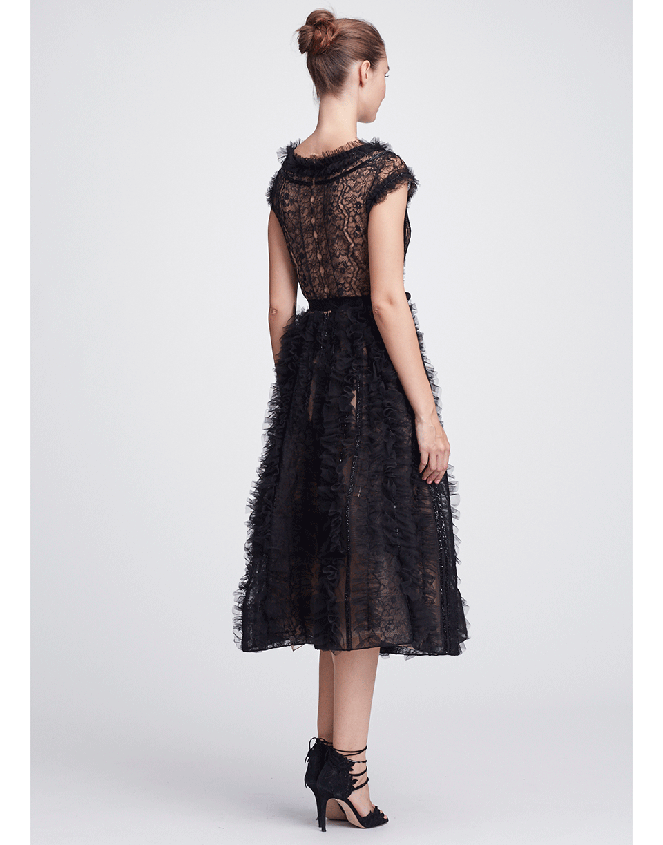 This black tulle flared midi dress by Marchesa features a feminine silhouette embroidered with delicate lace. It offers a dramatic plunging neckline with a round back, cap sleeves, a cinched waist with ribbon tie and side slip pockets.