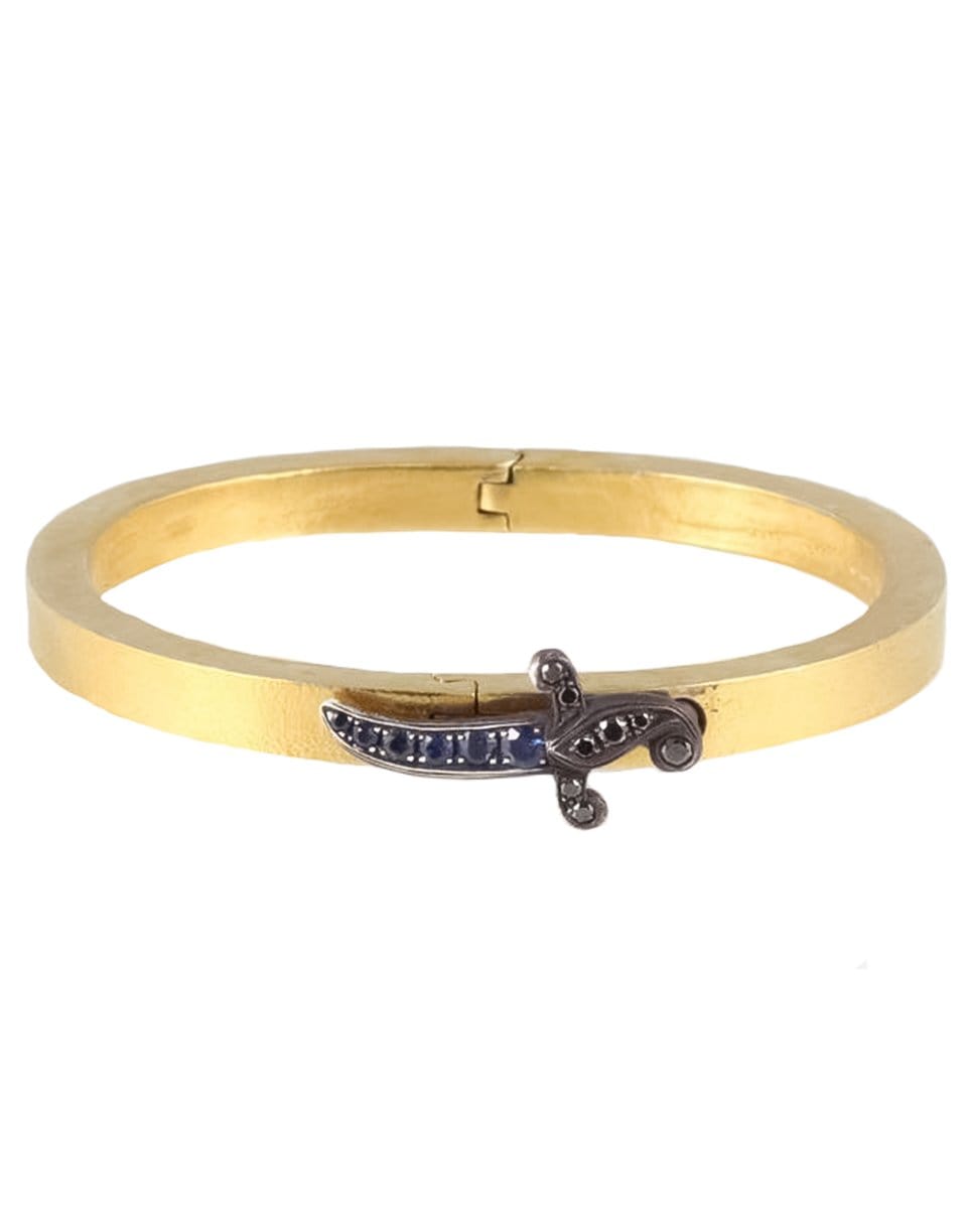 Sevan Bicakci polished gold bangle with blue sapphire and diamond dagger clasp.
