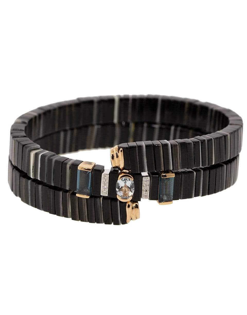 Federica Rettore Pop Horn bracelet with brilliant cut diamonds, oval aquamarine, baguette blue topaz, and black Zebu horn.