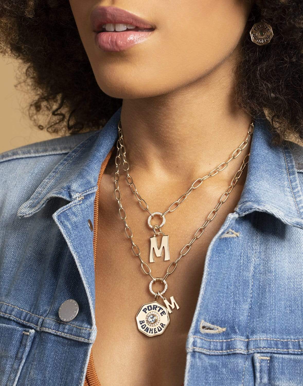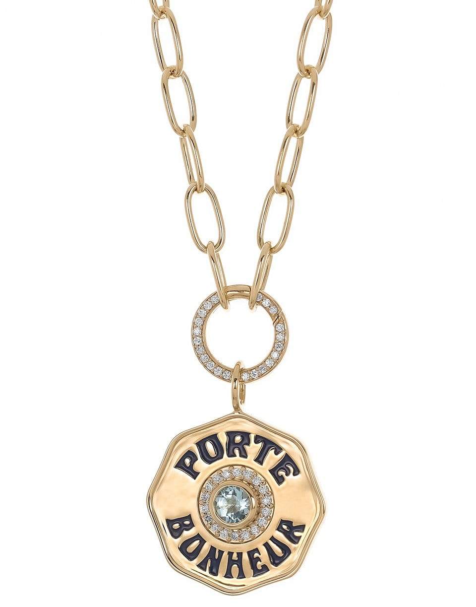 Marlo Laz porte bonheur aquamarine pendant necklace on sardinia pave clasp chain. French for lucky charm, the Porte Bonheur Large Coin Necklace serves as a precious symbol of protection and good fortune. The coin is centered with an aquamarine and a halo of diamond pavé that accents the hand-painted, navy blue enamel 'Porte Bonheur' inscription.