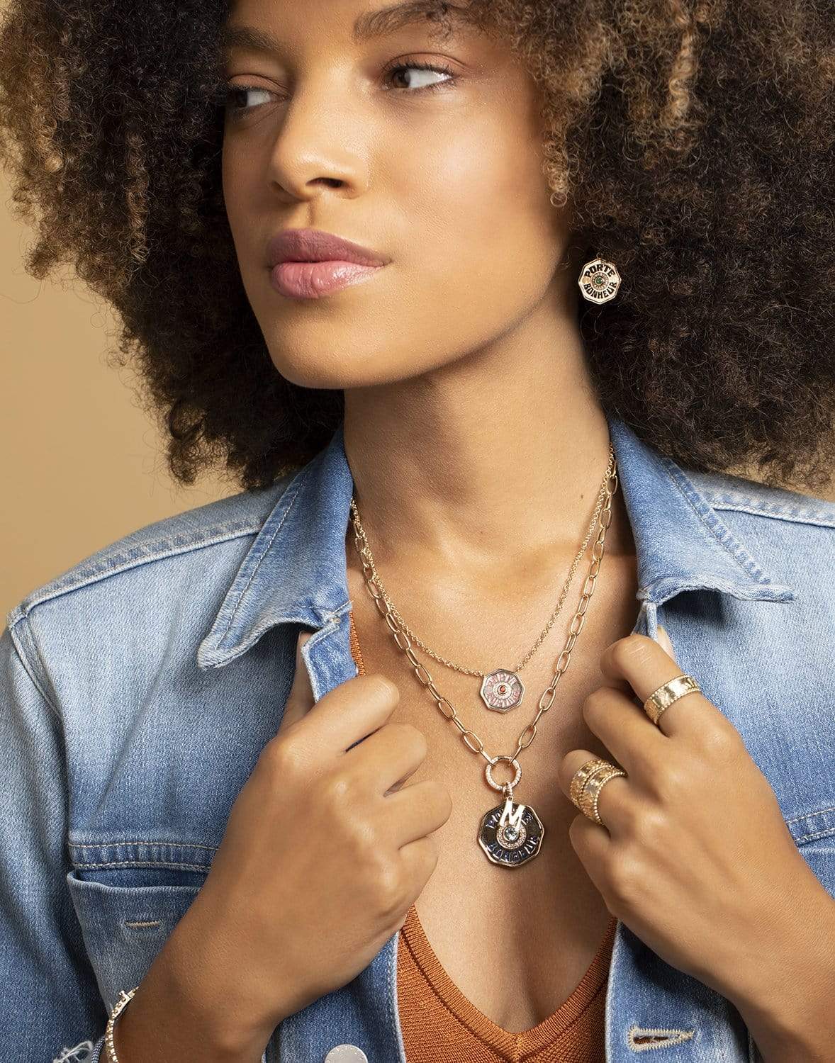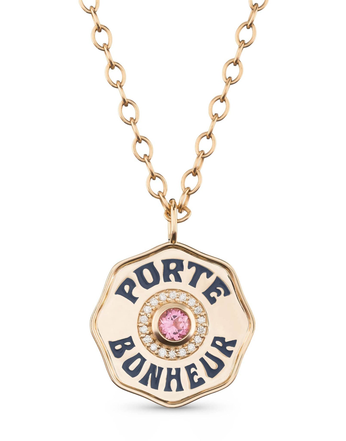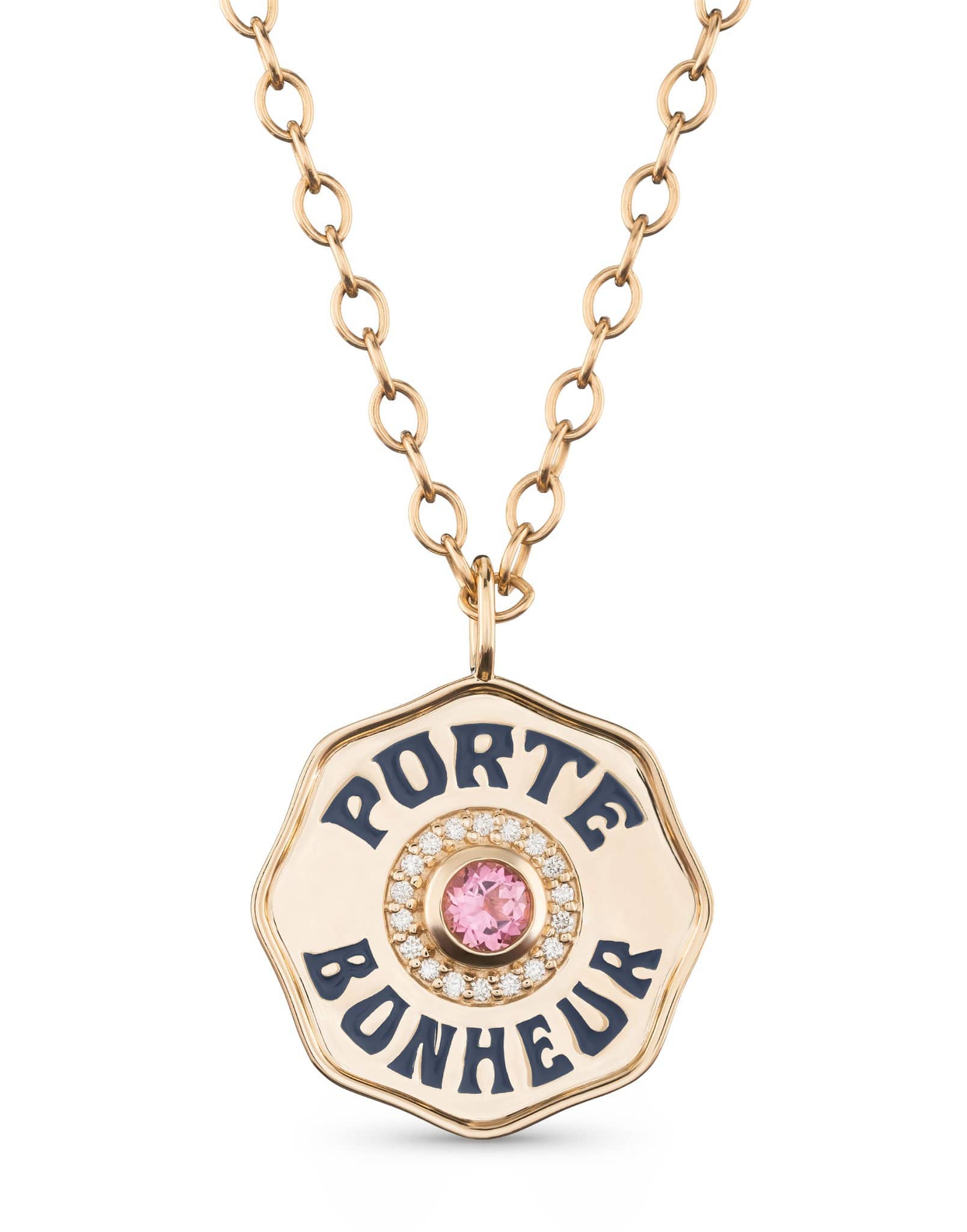 Marlo Laz porte bonheur pink tourmaline necklace. French for lucky charm, the Porte Bonheur Large Coin Necklace serves as a precious symbol of protection and good fortune. The coin is centered with pink tourmaline and a halo of diamond pavé that accents the hand-painted, navy blue enamel 'Porte Bonheur' inscription.