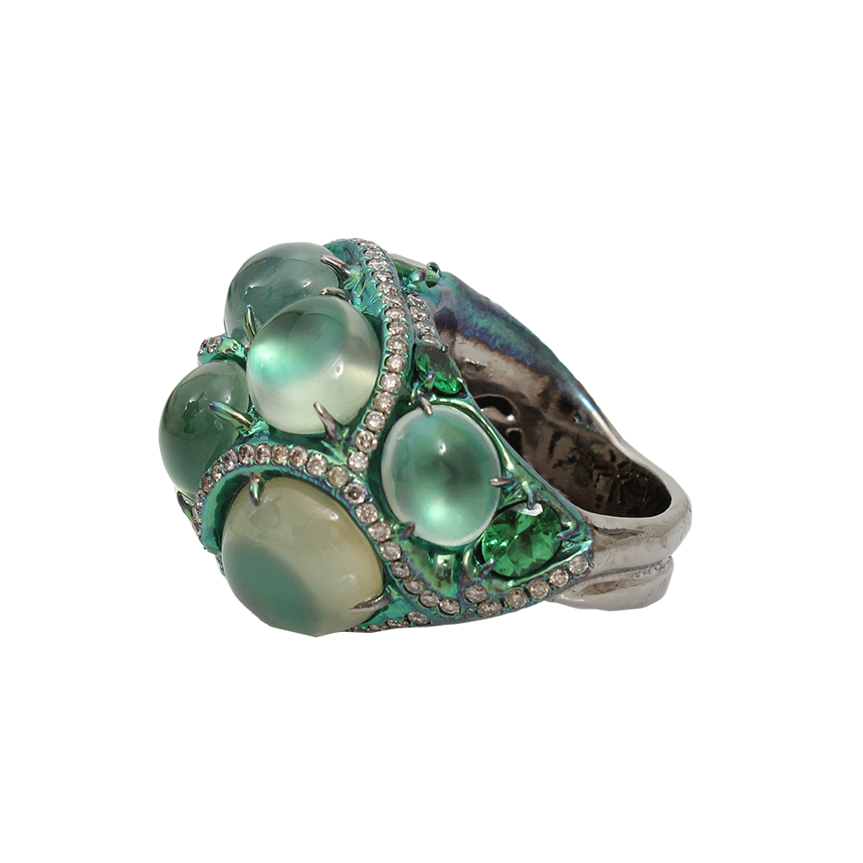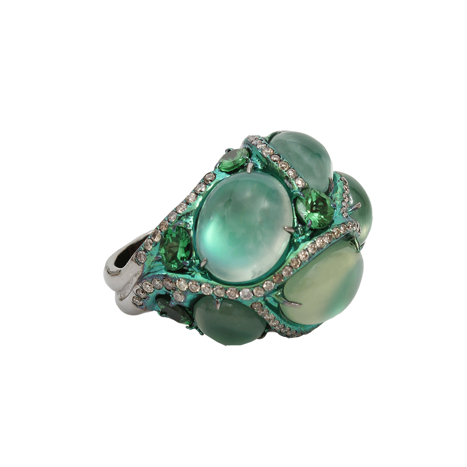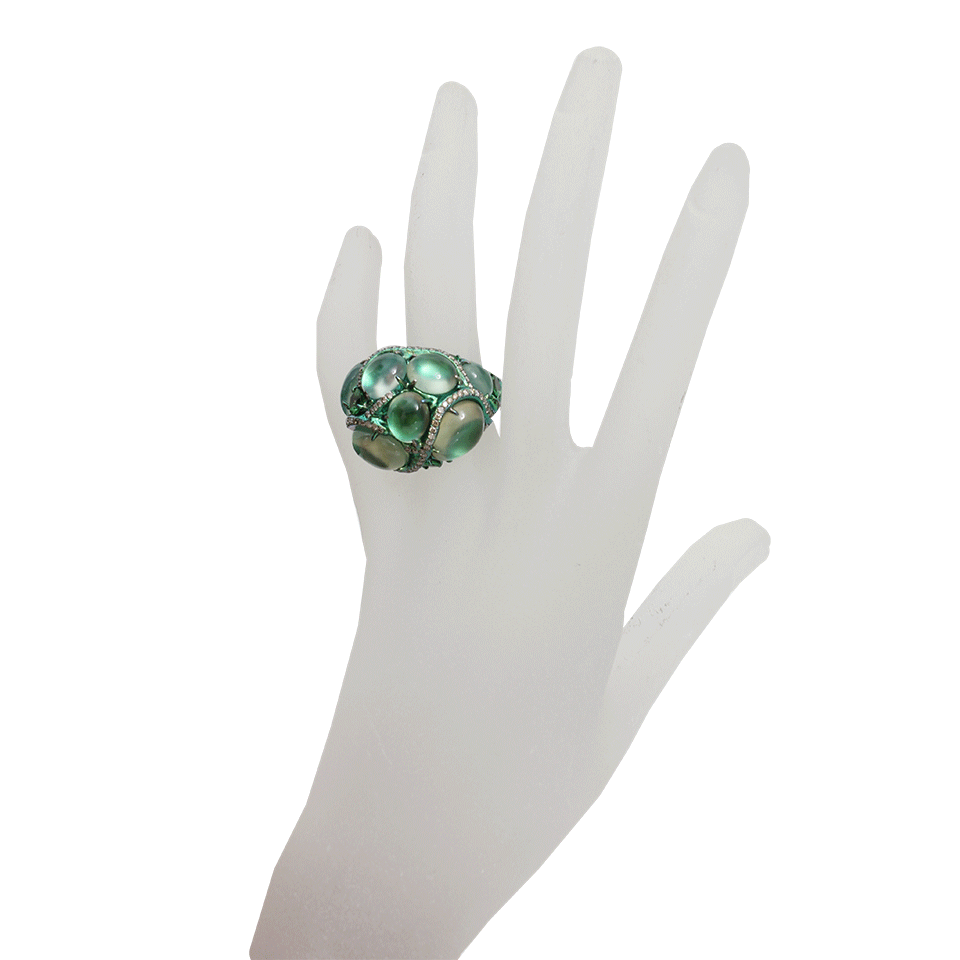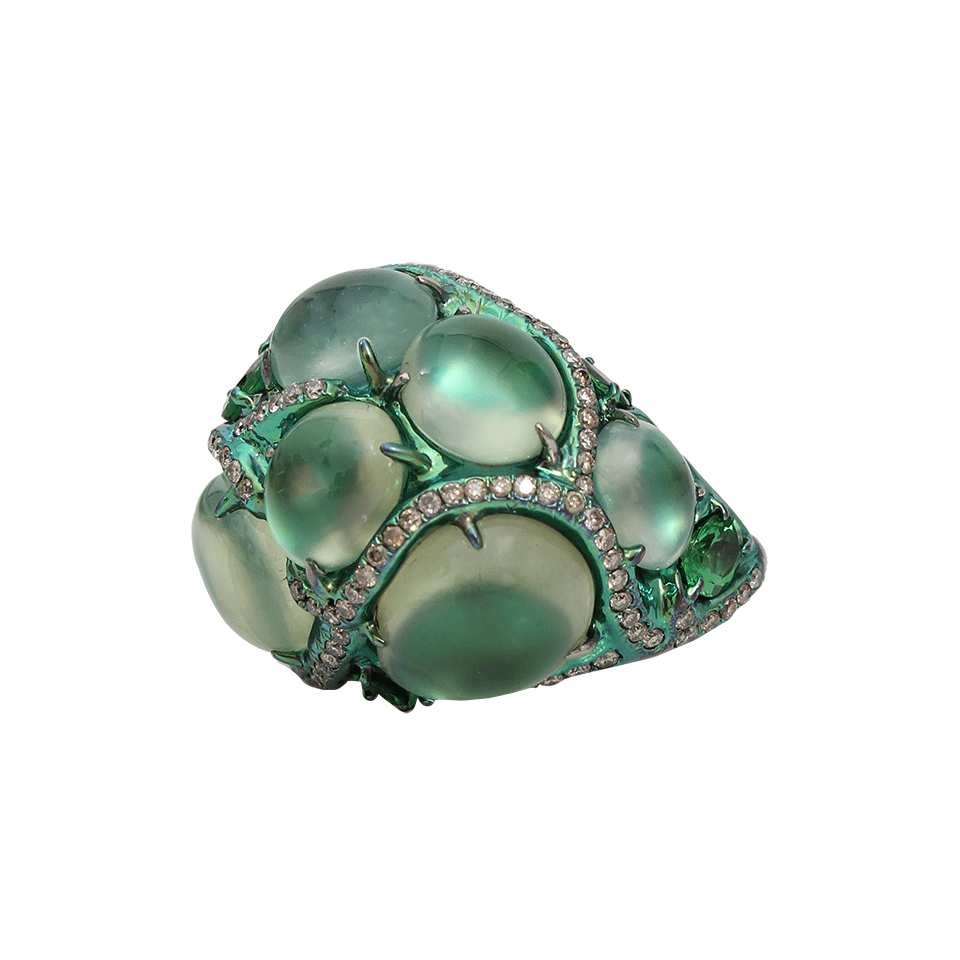 In bubbles of glowing glitz, this Arunashi prehnite ring encased in tsavorite will bring the perfect dose of shimmering color to any ensemble. Size 7, 1” Width Prehnite (35.23 CTW), Tsavorite (2.48 CTW) Diamonds (1.26 CTW) Available in Titanium
