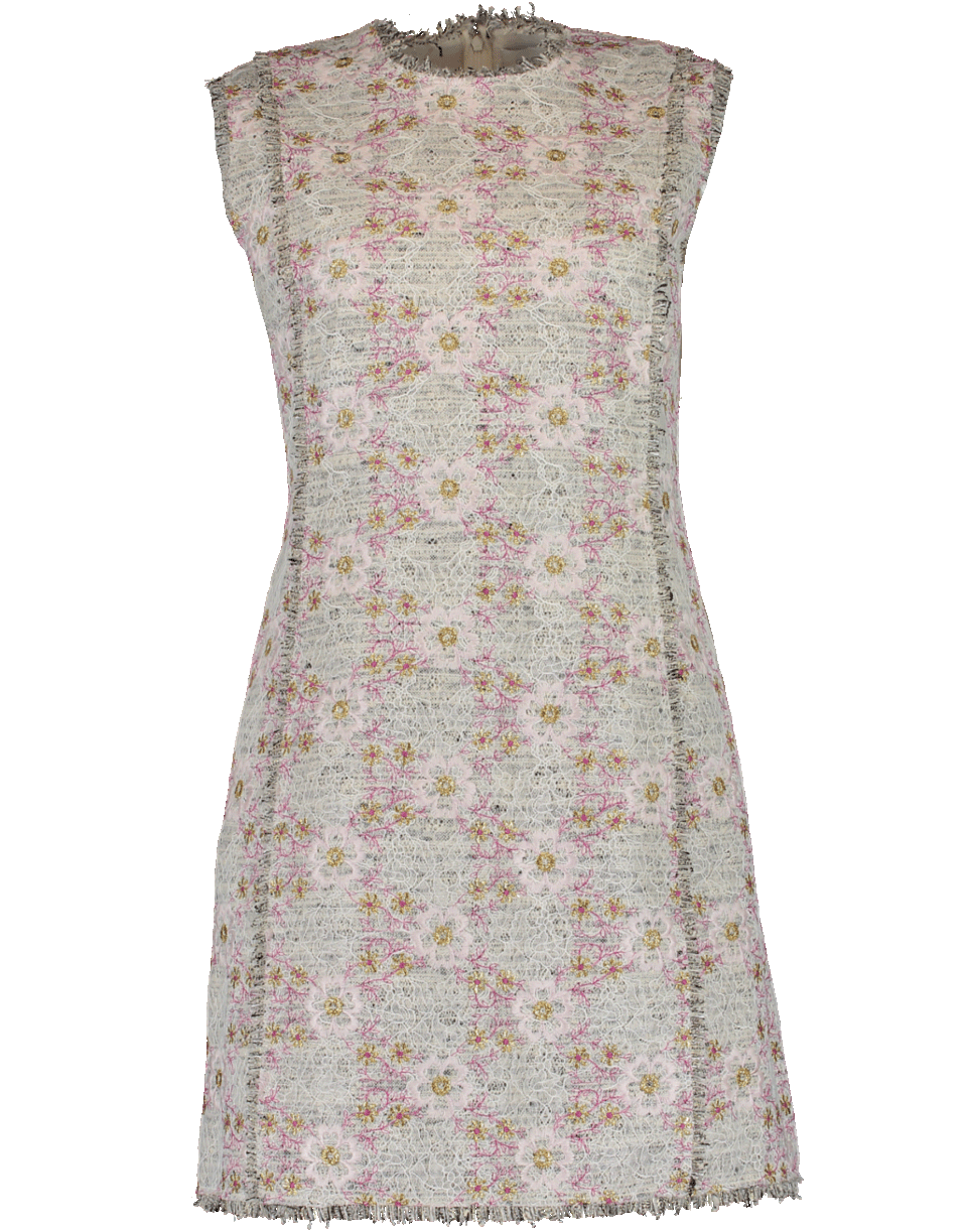 This tweed floral shift mini dress by Giambattista Valli features a round neck, a sleeveless shift silhouette with beaded floral embellishments, frayed edges, zip closure and knee length.