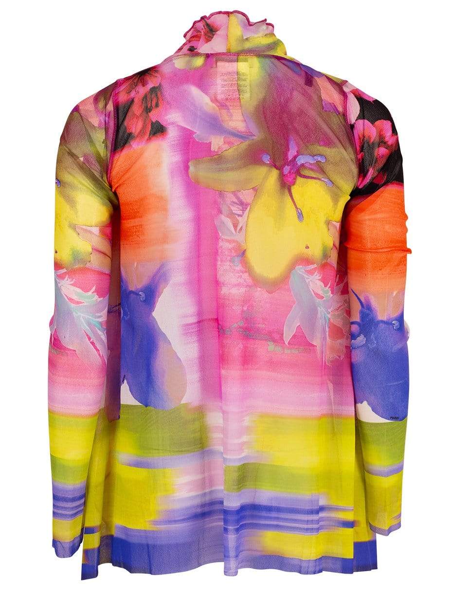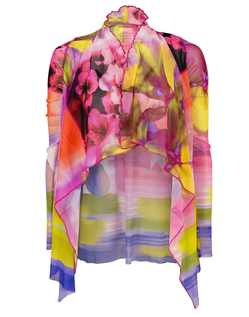 Fuzzi floral print drape front cardigan with thick bold pink hem stitching, drape front neckline, and long sleeves.