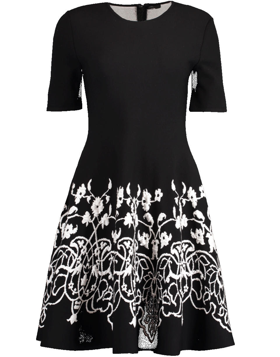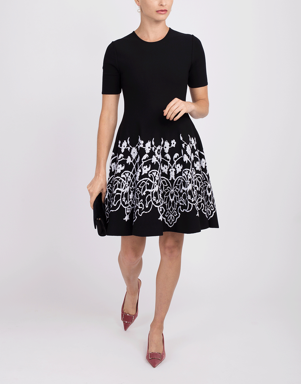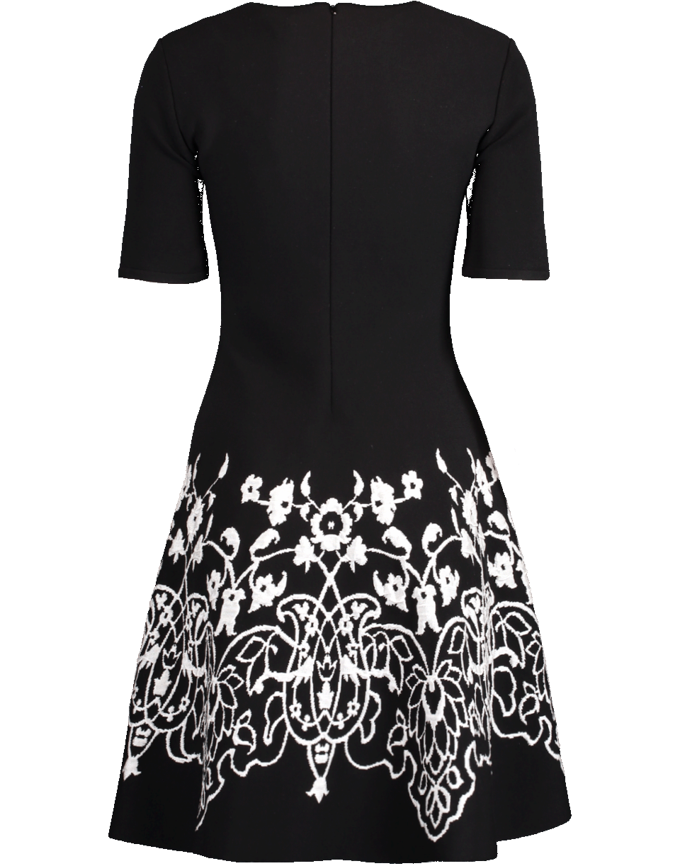 Black knit dress from Oscar de la Renta with a fit-and-flare silhouette, round neckline, 3/4 length sleeves, knee length, concealed zip closure, and finished with white jacquard pattern.