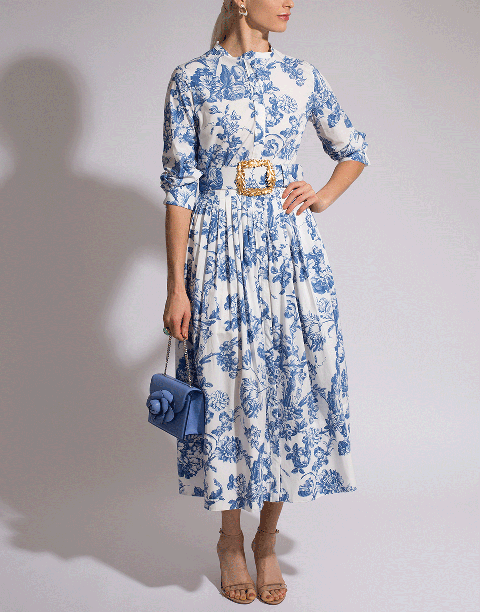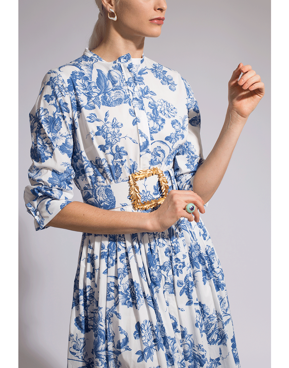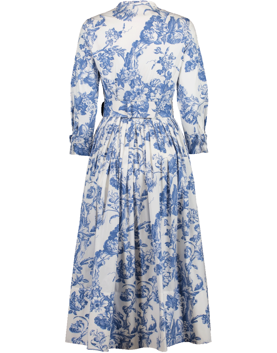 This blue and white delicate floral toile cotton-poplin shirtdress features a round neckline, midi length, 3/4 sleeves, full A-line skirt, front button closure and a removable wide belt (buckle not included).
