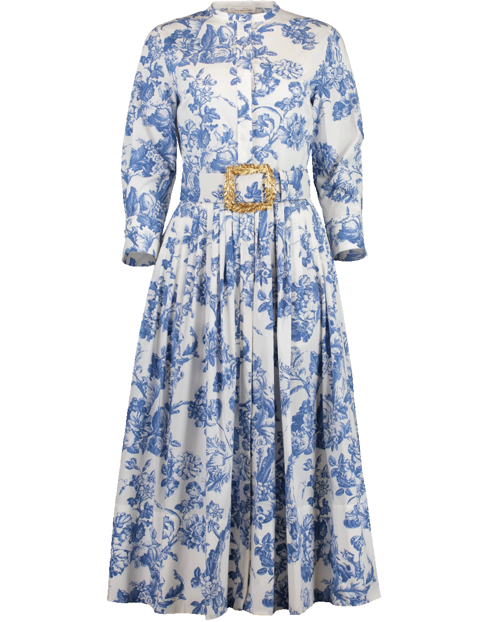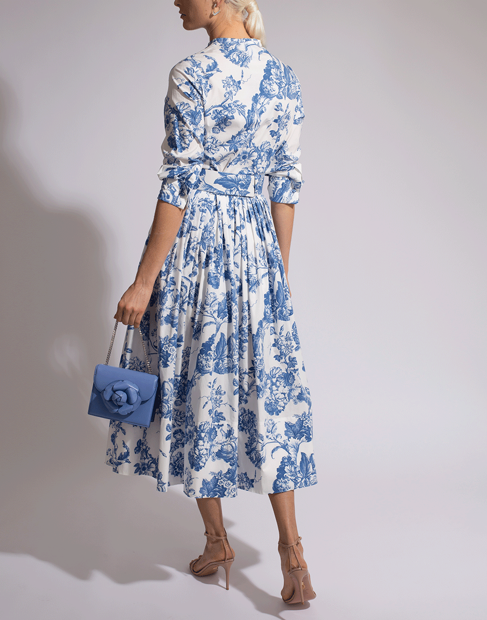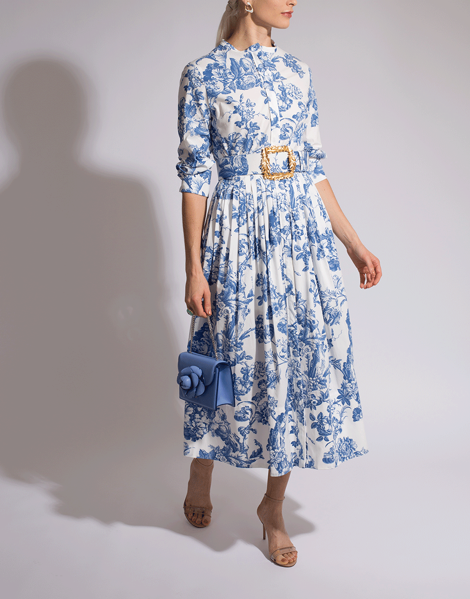 This blue and white delicate floral toile cotton-poplin shirtdress features a round neckline, midi length, 3/4 sleeves, full A-line skirt, front button closure and a removable wide belt (buckle not included).