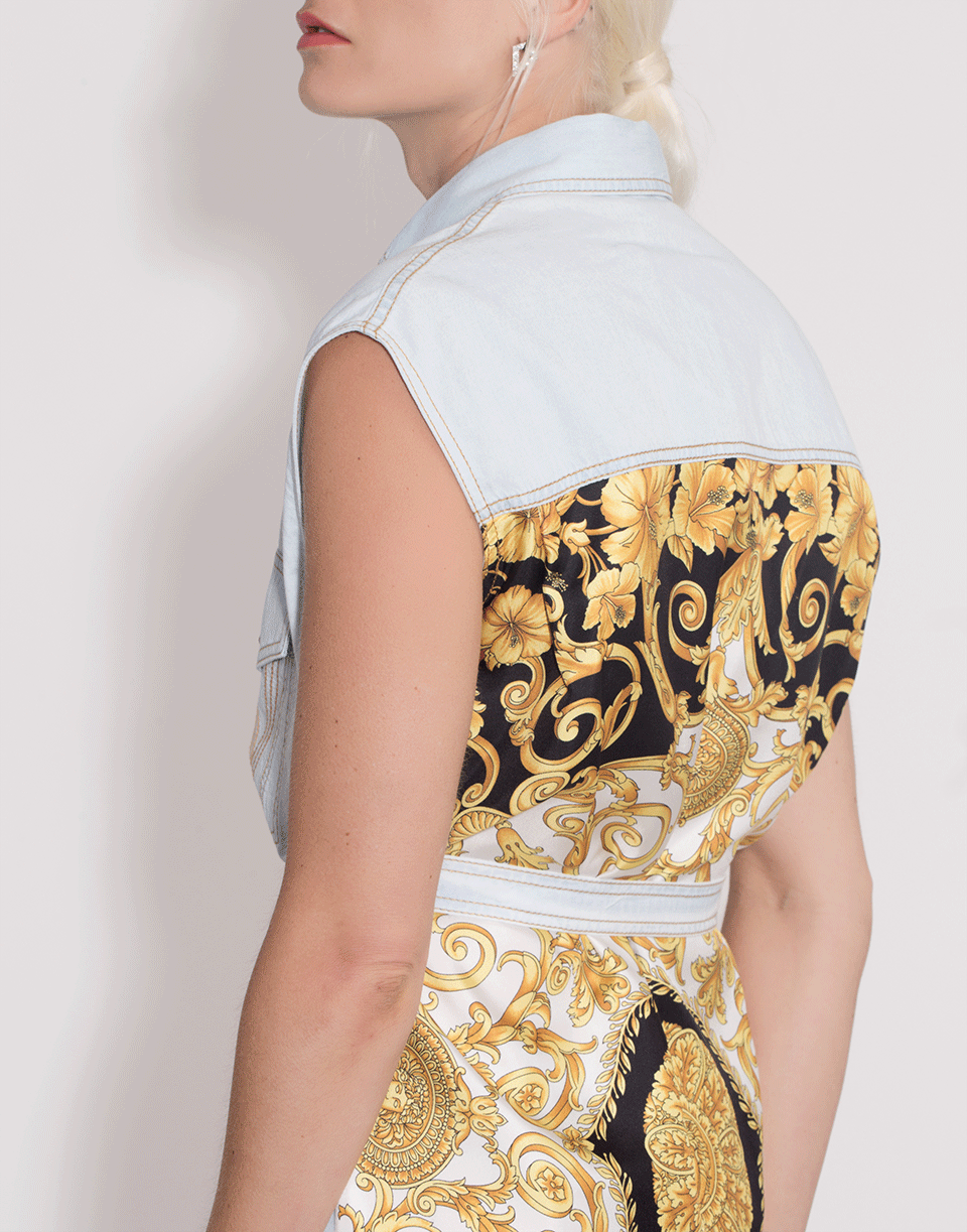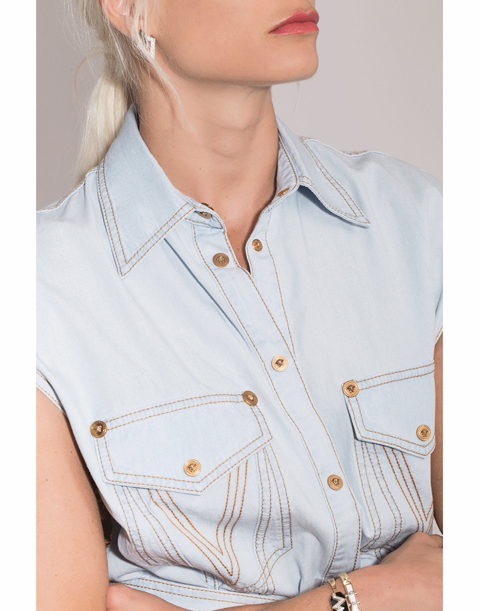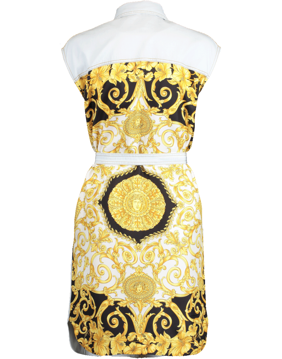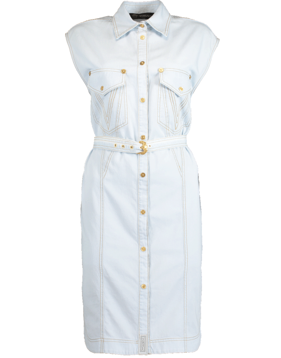 Denim shirtdress by Versace. This knee length shirt dress is crafted from light wash denim and silk. It features a pointed collar, cap sleeves, snap button front, patch pockets, detachable belt, gold stitching throughout and the brand’s signature print at back.