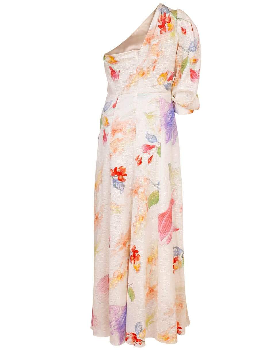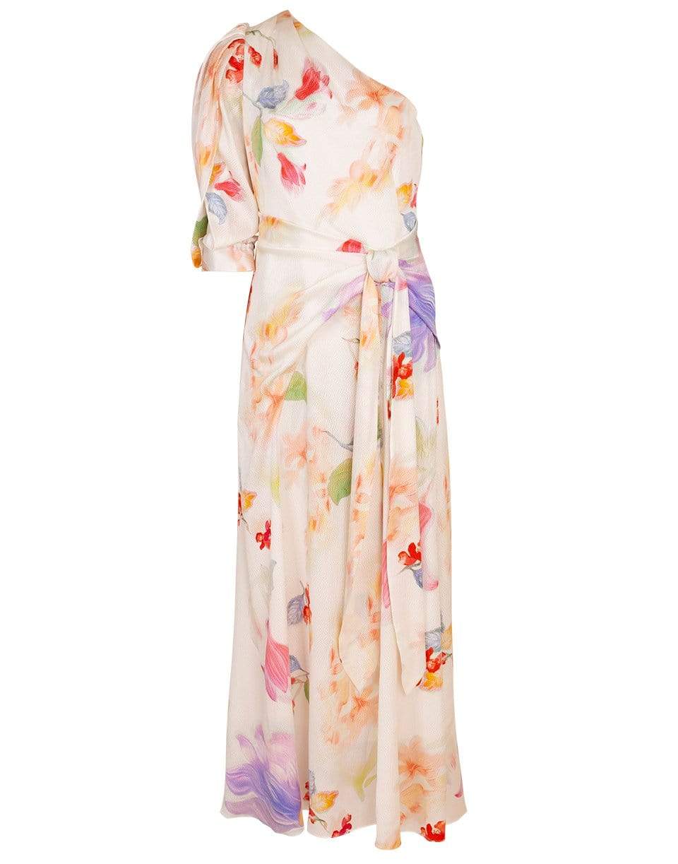 Peter Pilotto water flower printed silk one shoulder dress with a slim fit, twist waist detail, concealed back zip closure, and a full length.
