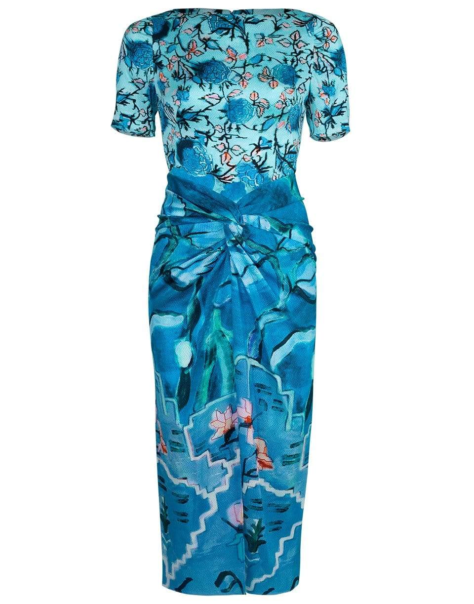 Peter Pilotto printed silk dress featuring short sleeves, a twist front with slit, concealed zip closure, boatneck, slim fit, and a mid-length.