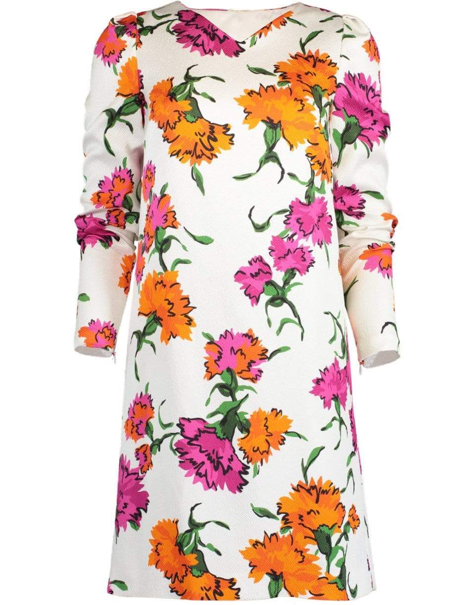 Escada Sport floral print dress with a regular fit, wide V-neck, long sleeves, side seam pockets, and an exposed back zip. Cut for a knee length.