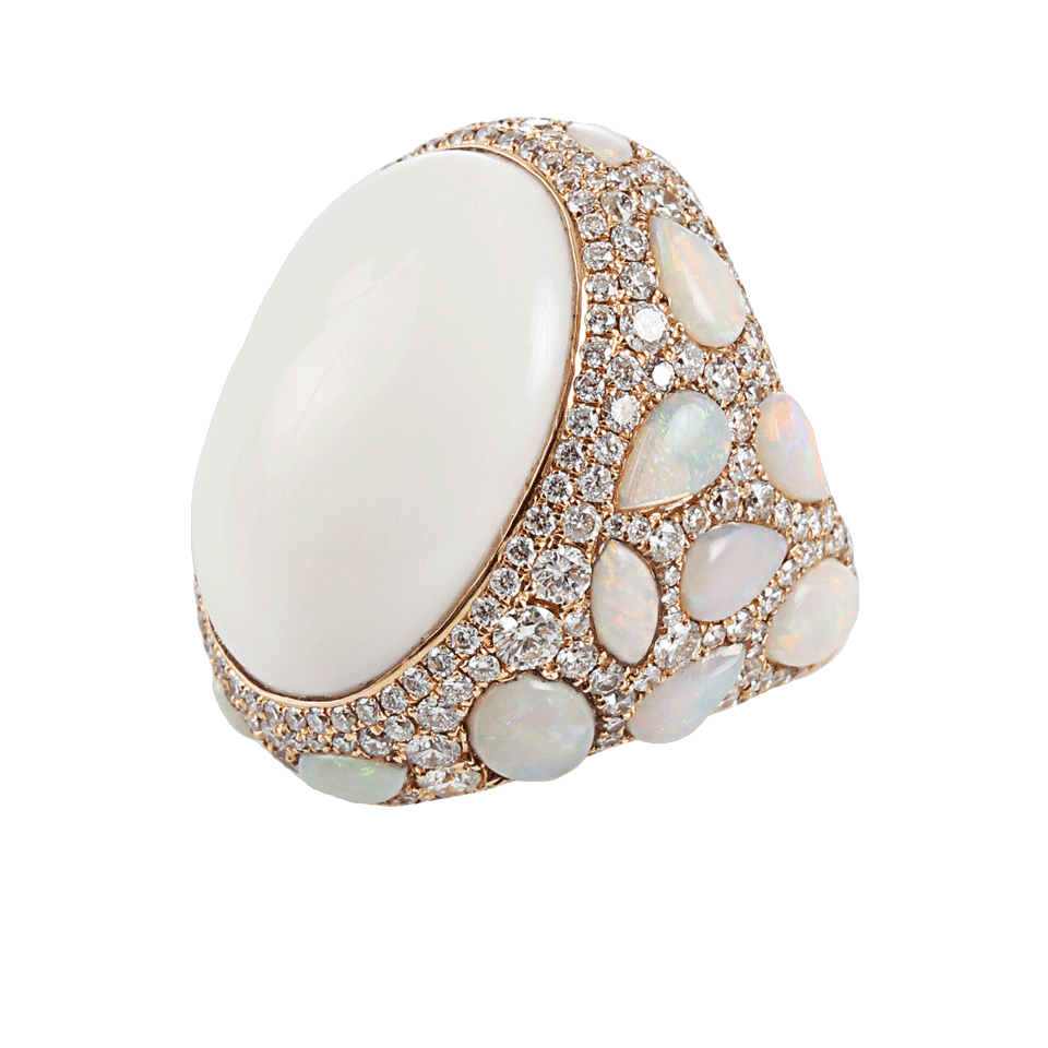 Cabochon-Cut White Coral Center Stone, Fire Opal and Pave White Diamond Detailing