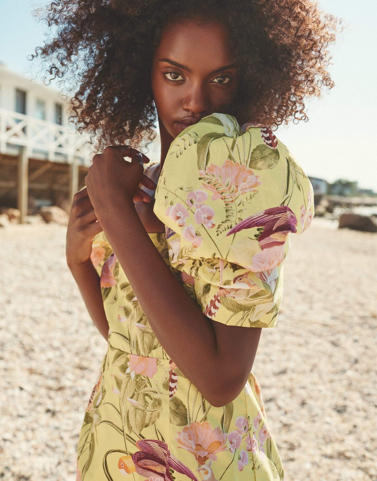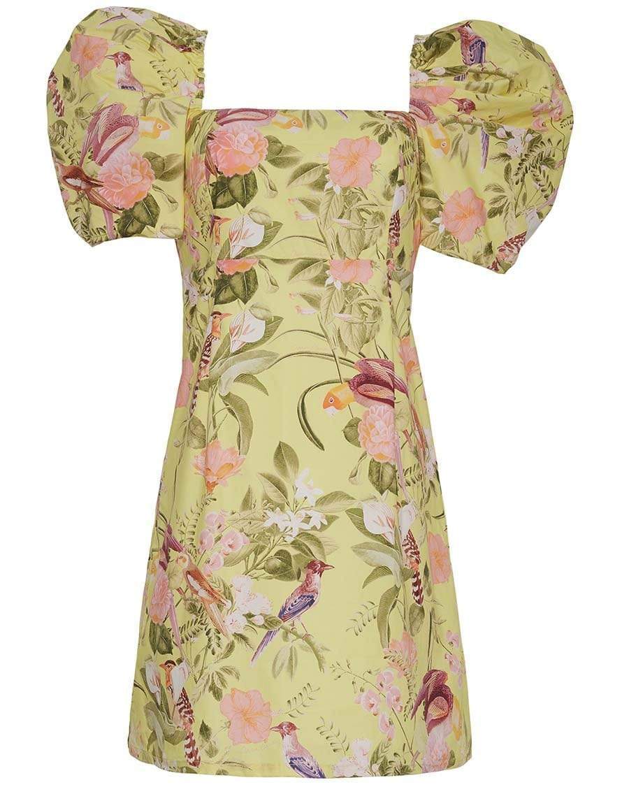 Cara Cara puff sleeve kelly dress in tropical birds raspberry is a short puff sleeve mini dress with smocked back.