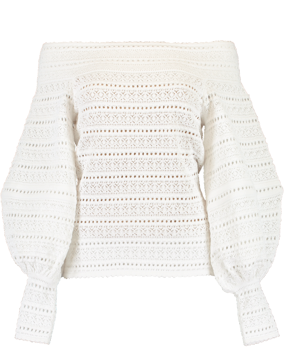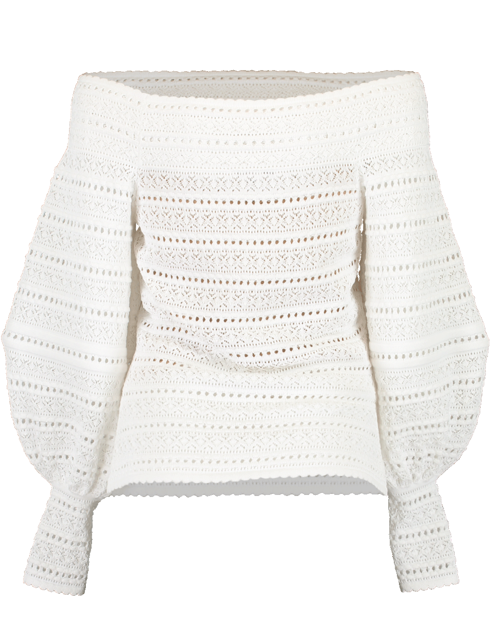 White off shoulder knit top by Oscar de la Renta. This off shoulder top features long balloon sleeves with narrow cuffs, a pullover style, slim fit and lace detail throughout.
