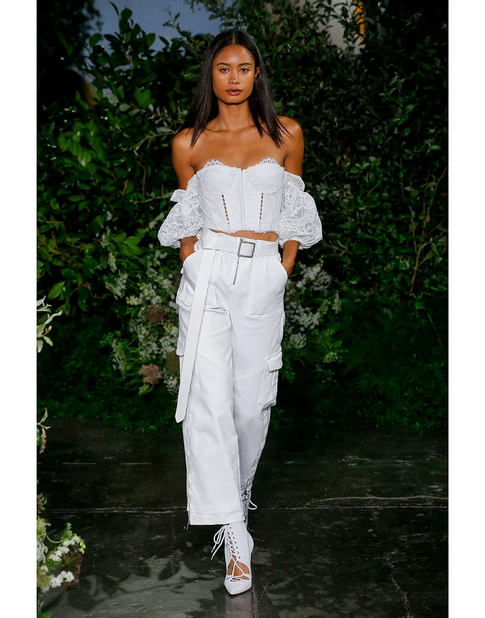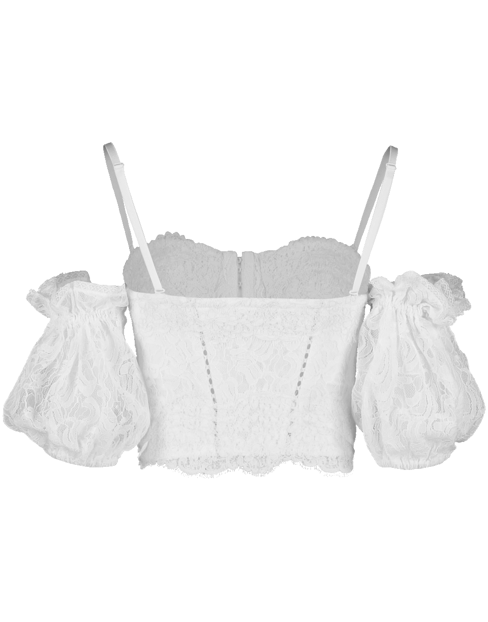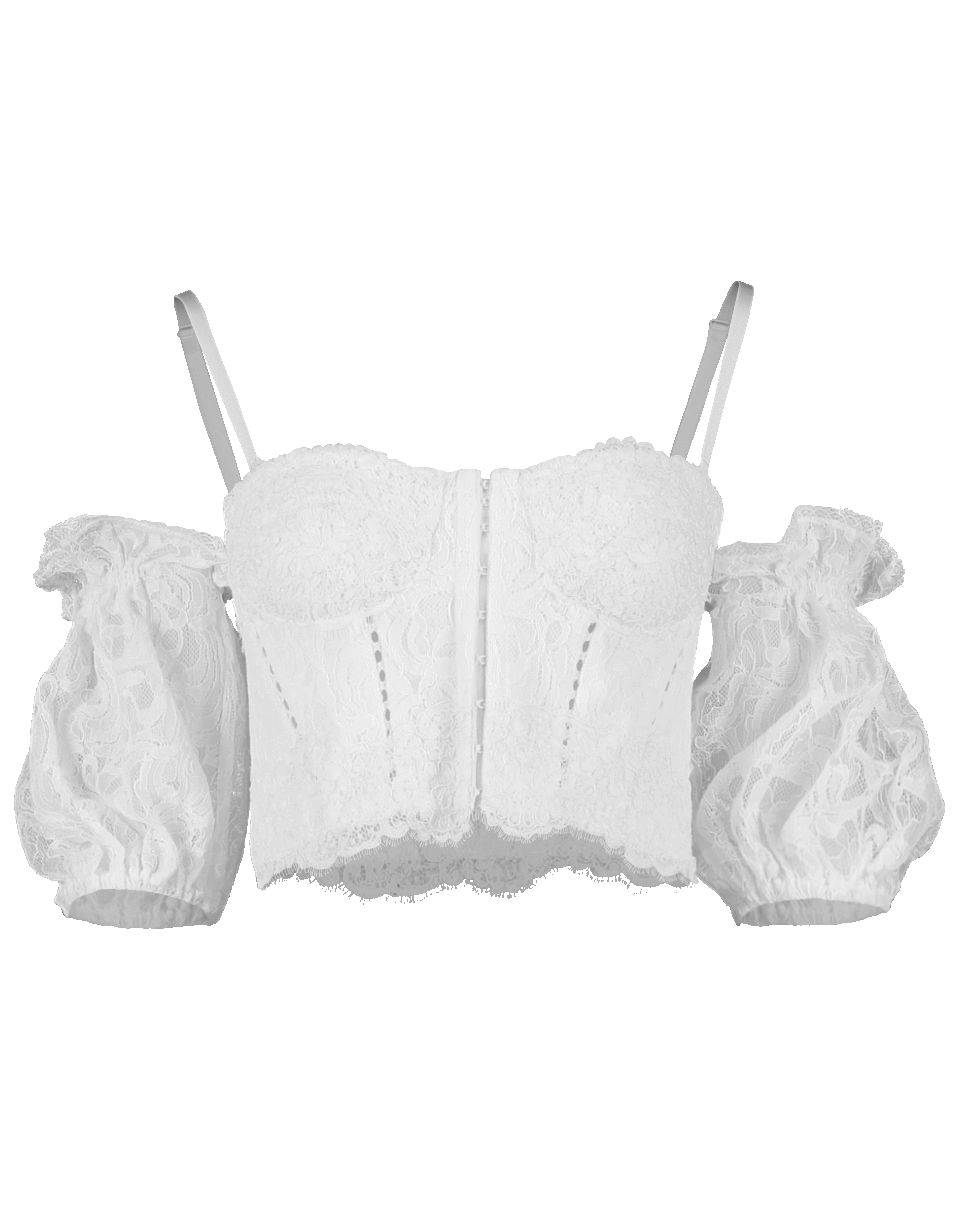 White lace bustier by Jonathan Simkhai. Get festival ready with this puff sleeve bustier, it features a corset-style front closure, removable shoulder straps, eyelet details with lace trims, sweetheart neckline, concealed hook-and-eye closure and elasticized short sleeves.